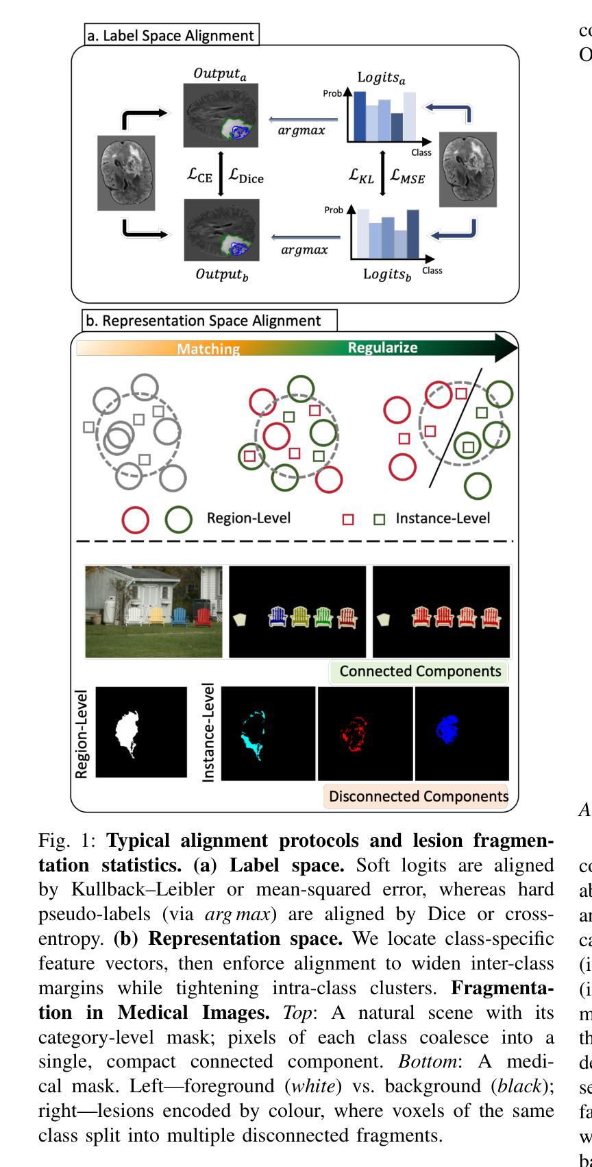 半监督医学图像分割(SSMIS)旨在匹配全监督性能的同时大幅度降低标注成本。主流SSMIS方法依赖于标签空间的一致性,却忽视了同样关键的表示空间对齐。没有协调潜在特征,模型在学习既有辨别力又空间连贯的表示时倍感困难。为此,我们引入了表示空间和标签空间的双向对齐(BARL),这是一个统一框架,包含两个协同分支并在两个空间内强制执行对齐。对于标签空间对齐,我们受到协同训练和多尺度解码的启发,设计了双路径正则化(DPR)和渐进认知偏差校正(PCBC),以在分支之间实现精细粒度的一致性,同时减轻从粗到细尺度的误差累积。对于表示空间对齐,我们在分支之间进行区域级别和病变实例匹配,明确捕捉医学图像中常见的碎片化、复杂病理模式。在四个公共基准测试和专有CBCT数据集上的大量实验表明,BARL始终超越最新SSMIS方法。消融研究进一步验证了每个组件的贡献。代码将很快发布。