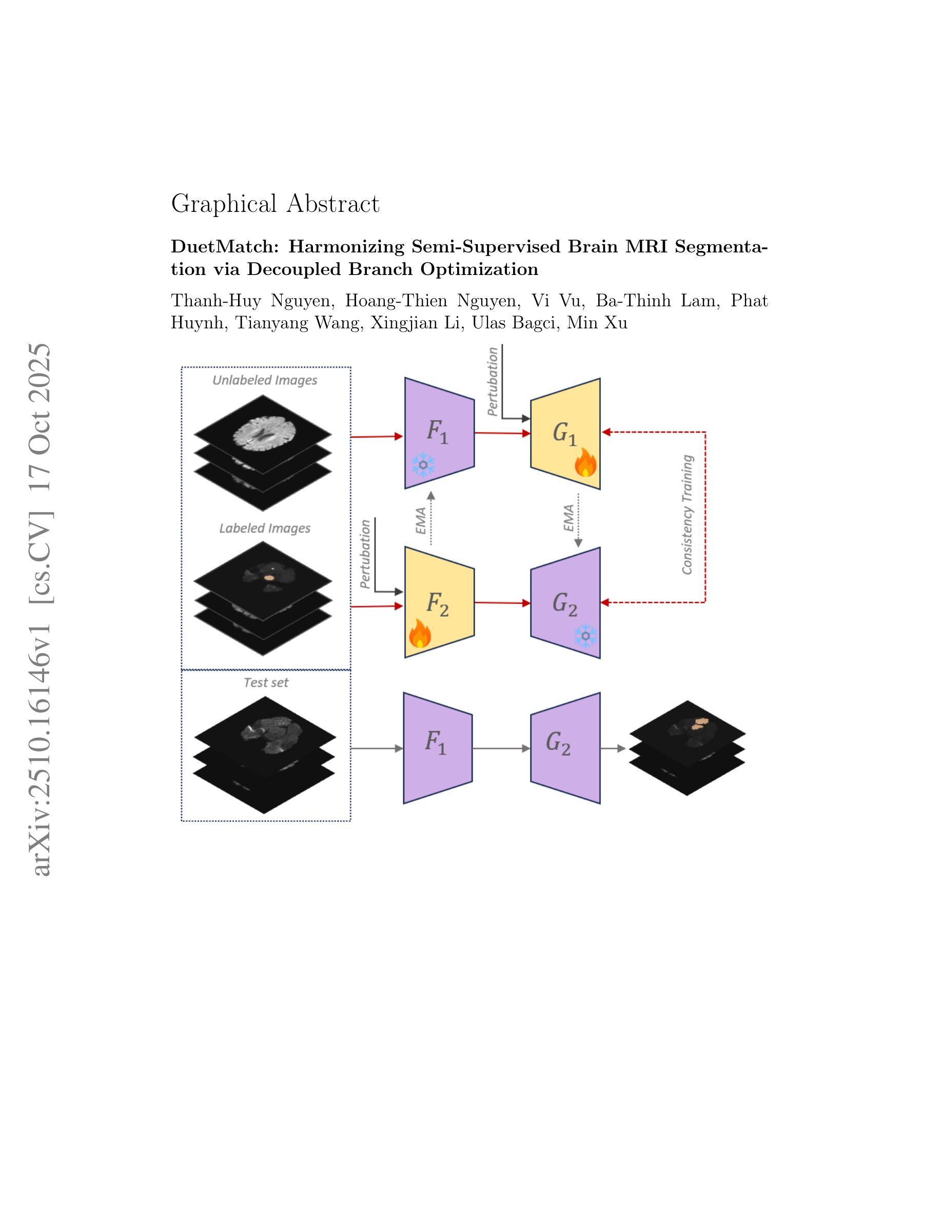 在医学成像中,标注数据的有限可用性使得半监督学习因其从非完美监督中学习的能力而越来越受欢迎。最近,师徒框架因其训练效益和稳健性能而受到欢迎。然而,同时优化整个网络可能会阻碍收敛和稳定性,尤其在具有挑战性的场景中。为了解决医学图像分割中的这一问题,我们提出了DuetMatch,这是一种具有异步优化的新型双分支半监督框架,每个分支可以优化编码器或解码器,同时保持另一个分支冻结。为了提高在有噪声条件下的一致性,我们引入了去耦dropout扰动,在分支之间实施正则化。我们还设计了Pair-wise CutMix Cross-Guidance,通过增强输入对交换伪标签来增强模型多样性。为了减少来自噪声伪标签的确认偏见,我们提出了一致性匹配,使用稳定的预测结果对冻结的教师模型进行标签细化。在ISLES2022和BraTS等基准大脑MRI分割数据集上的广泛实验表明,DuetMatch始终优于最先进的方法,证明了其在各种半监督分割场景中的有效性和稳健性。