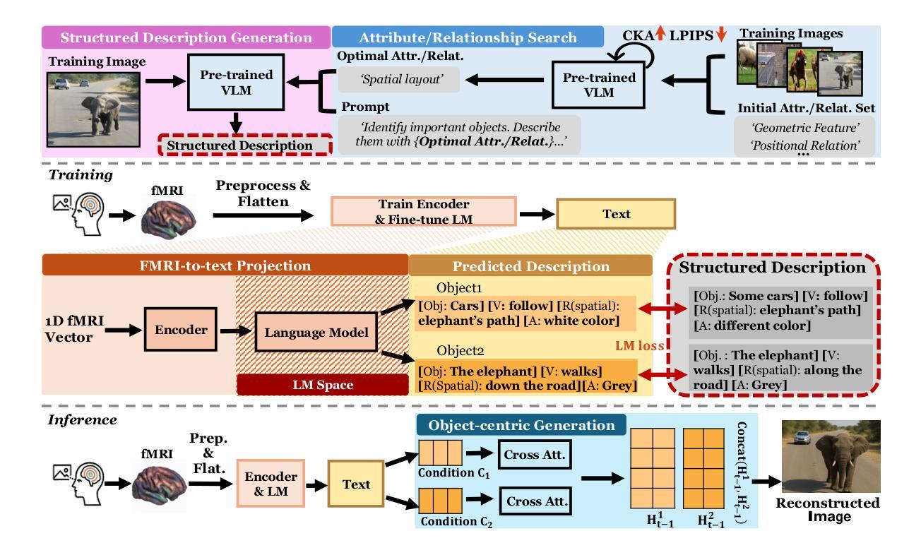 理解大脑如何编码视觉信息是神经科学和机器学习领域的一个核心挑战。一种有前途的方法是通过功能磁共振成像(fMRI)信号重建视觉刺激,本质上是图像。这涉及两个阶段:将fMRI信号转换为潜在空间,然后使用预训练的生成模型来重建图像。重建质量取决于潜在空间与神经活动结构之间的相似性,以及生成模型从该空间生成图像的能力。然而,仍不清楚哪种类型的潜在空间最适合支持这种转换,以及如何组织它以有效地表示视觉刺激。我们提出两个关键发现。首先,fMRI信号与语言模型的文本空间更为相似,而不是基于视觉的空间或联合文本图像空间。其次,文本表示和生成模型应适应于捕捉视觉刺激的组成性质,包括物体、其详细属性和关系。基于这些见解,我们提出了PRISM模型,该模型将fMRI信号投影到结构化文本空间作为视觉刺激重建的中间表示。它包括一个以对象为中心的扩散模块,通过组合单个对象来生成图像,以减少对象检测错误;以及一个属性关系搜索模块,该模块自动识别与神经活动最佳对齐的关键属性和关系。在现实数据集上的大量实验表明,我们的框架优于现有方法,感知损失减少了高达8%。这些结果强调了使用结构化文本作为连接fMRI信号和图像重建的中间空间的重要性。