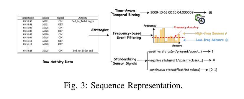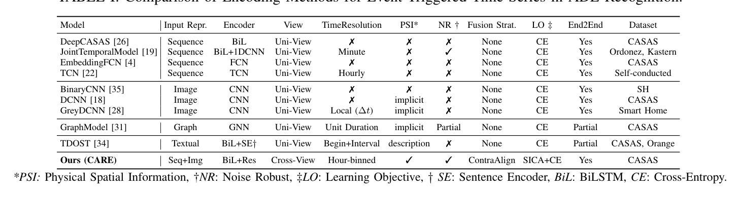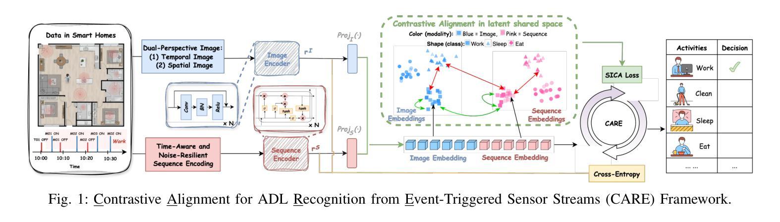 从事件触发的环境传感器识别日常活动(ADLs)是环境辅助生活的一项重要任务,但现有方法仍受到表示层面上的限制。基于序列的方法保持了传感器激活的时间顺序,但对噪声敏感,缺乏空间意识。而基于图像的方法捕捉全局模式和隐含的空间相关性,但会压缩精细的时间动态并扭曲传感器布局。简单的融合方法(例如特征拼接)未能加强序列和图像表示视图之间的对齐,未能充分利用它们的互补优势。我们提出了对比对齐方法(CARE),用于从事件触发的传感器流中识别ADL。CARE是一个端到端的框架,通过序列图像对比对齐(SICA)和交叉熵分类联合优化表示学习,确保跨表示对齐和任务特定的鉴别能力。CARE集成了(i)时间感知、噪声弹性的序列编码和(ii)空间感知和频率敏感的图像表示,并采用了(iii)联合对比分类目标,以学习对齐和鉴别性的嵌入的端到端学习。在三个CASAS数据集上进行的评估表明,CARE达到了最先进的性能(米兰89.8%,开罗88.9%,京都7达到73.3%),并展示了对传感器故障和布局变化的稳健性,突出了其在智能家居中进行可靠ADL识别的潜力。