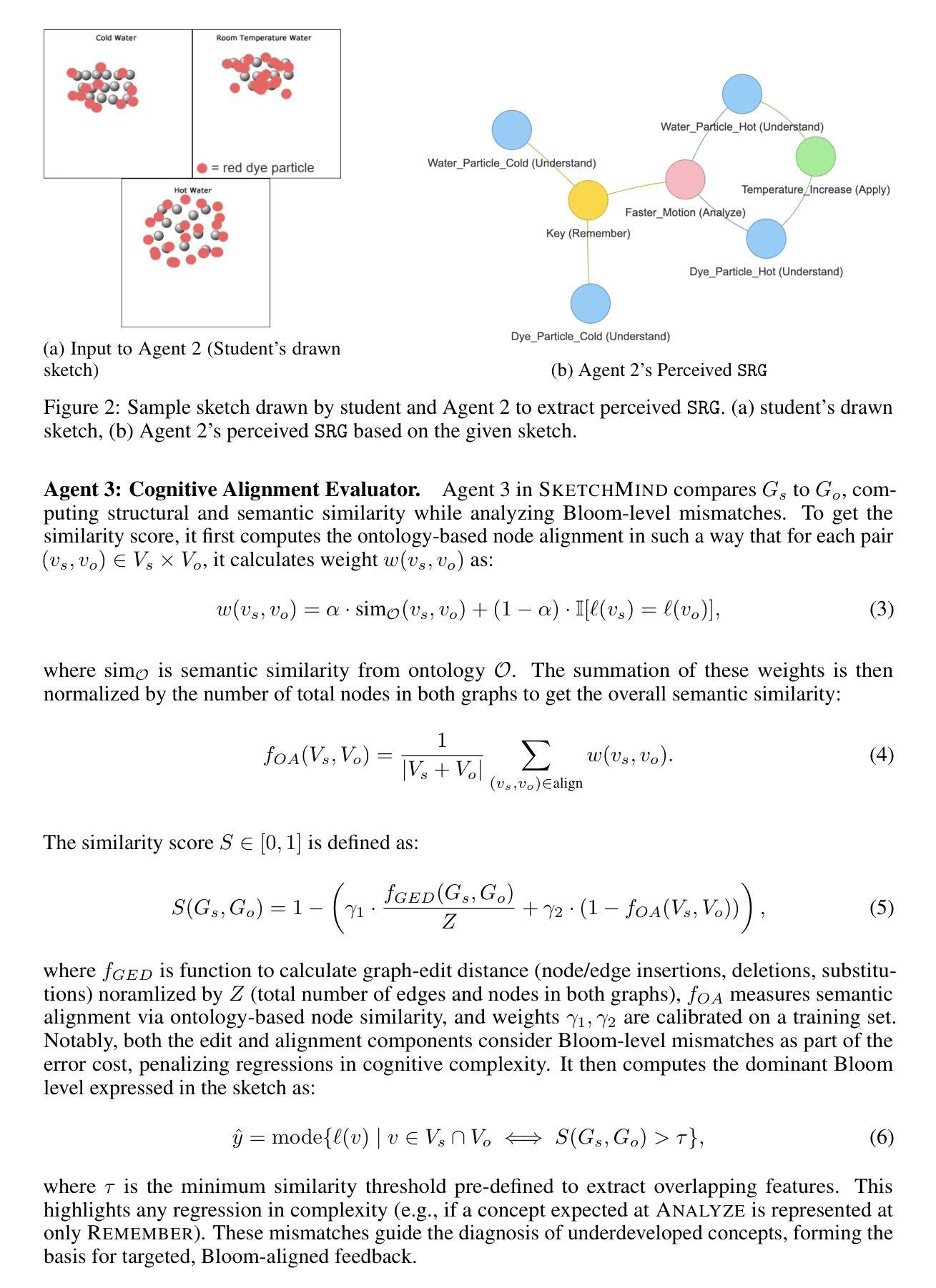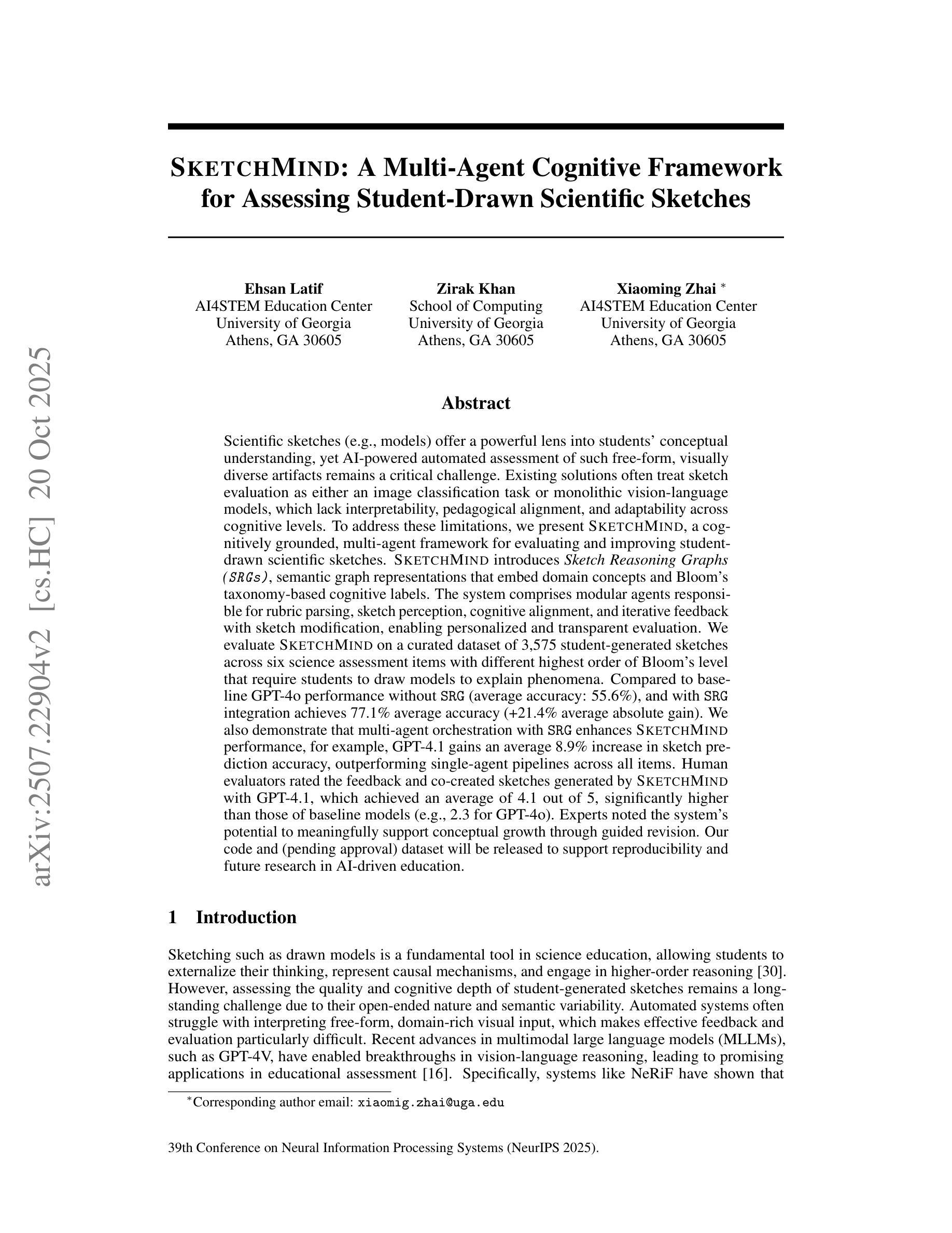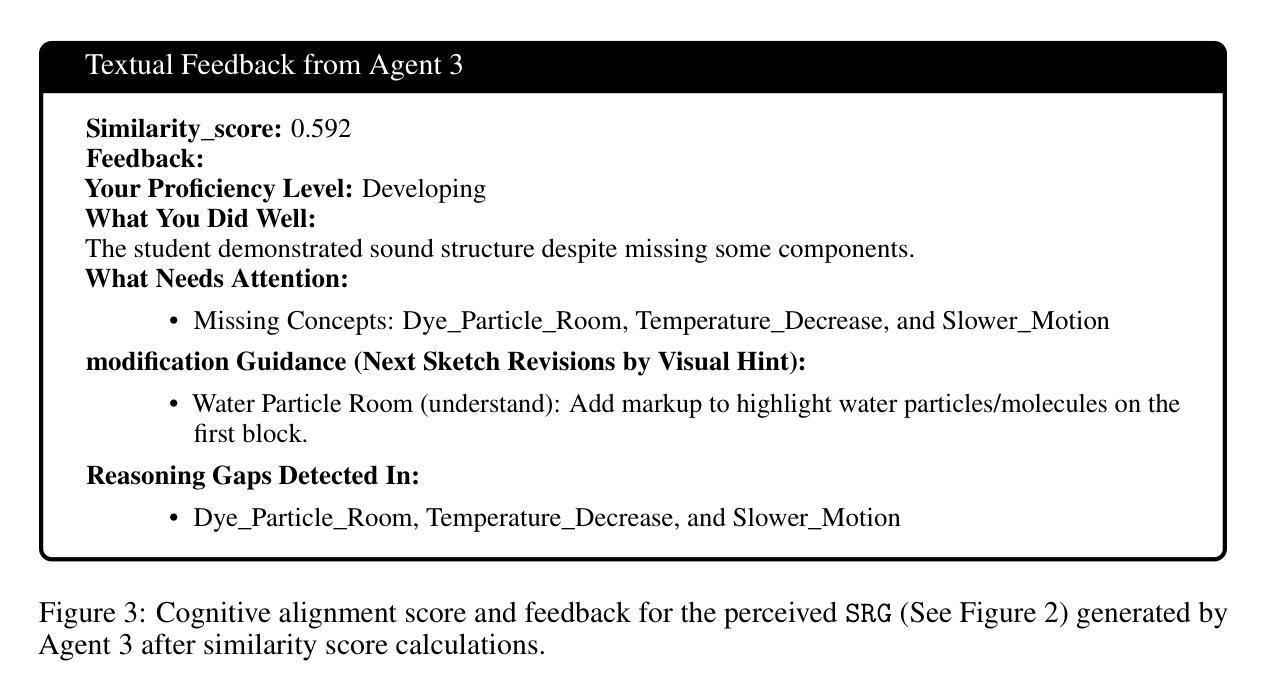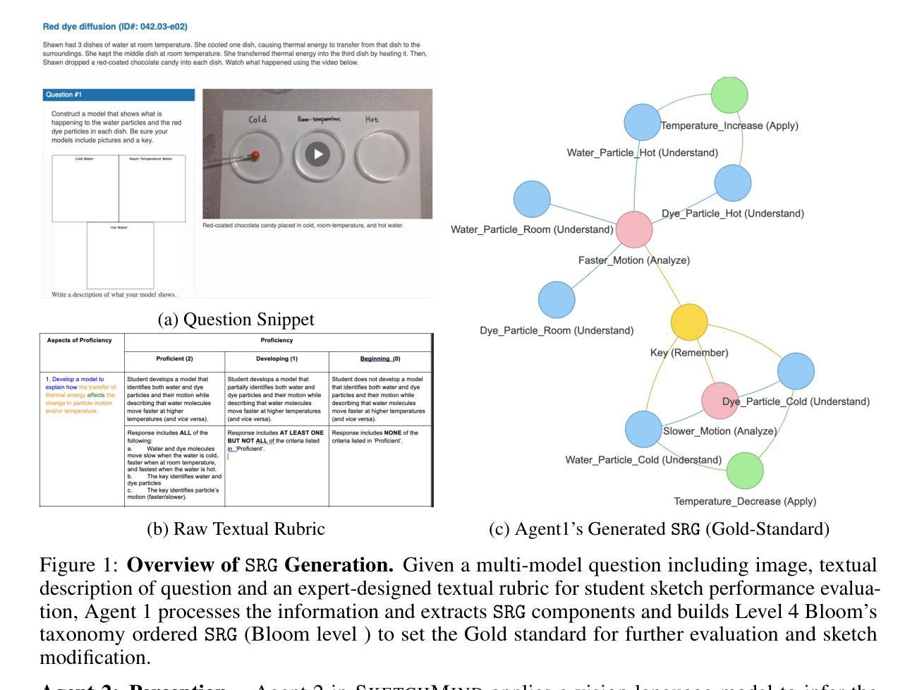 科学草图(例如模型)为学生们的概念理解提供了一个强大的视角,然而,对于此类自由形式、视觉多样化的伪作的人工智能驱动的自动评估仍然是一个关键挑战。现有解决方案通常将草图评估视为图像分类任务或单一视觉语言模型,这缺乏解释性、教学对齐和不同认知层次的适应性。为了解决这些局限性,我们推出了SketchMind,这是一个基于认知的多智能体框架,用于评估和改进学生绘制的科学草图。SketchMind包含模块化智能体,负责规则解析、草图感知、认知对齐以及草图修改的迭代反馈,能够实现个性化和透明的评估。我们在一个包含3575个学生生成草图的定制数据集上评估了SketchMind,这些草图涵盖了六个需要学生通过绘制模型来解释现象的科学评估项目,并且这些项目的Bloom等级要求各不相同。与没有SRG的GPT-4o基线性能相比(平均准确率:55.6%),以及通过SRG集成实现的平均准确率77.1%(平均绝对增益+21.4%)。我们还证明了带有SRG的多智能体协同工作可以提高SketchMind的性能,例如GPT-4.1在草图预测准确率上平均提高了8.9%,在所有项目上超越了单智能管道。人类评估者评价了SketchMind与GPT-4.1共同生成的反馈和草图,其平均得分为4.1(满分5分),远高于基线模型的得分(例如GPT-4o的2.3分)。专家指出,该系统有潜力通过指导修订来支持有意义的概念增长。我们的代码(待批准)和数据集将发布,以支持可重复性和人工智能驱动教育的未来研究。