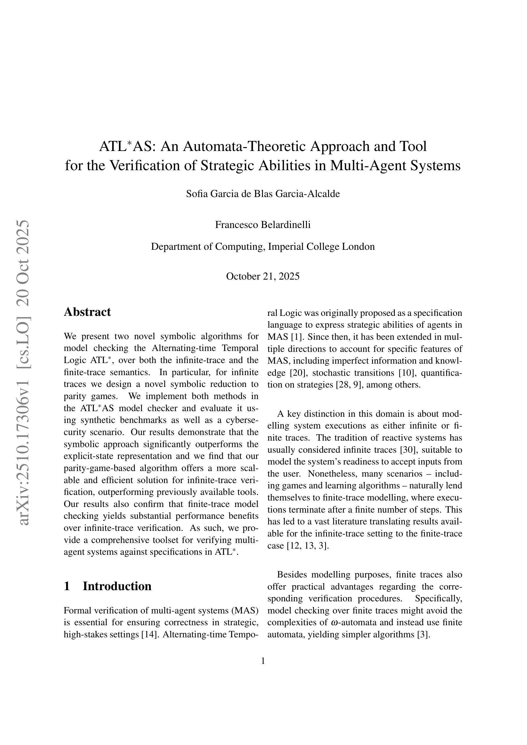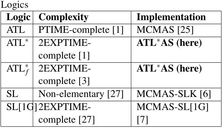 我们为交替时间时序逻辑ATL提出了两种新型符号算法,用于检查无限跟踪和有限跟踪语义。特别是,对于无限跟踪,我们设计了一种新型的符号简化为奇偶游戏。我们在ATLAS模型检查器中实现了这两种方法,并使用合成基准测试以及网络安全场景对其进行评估。结果表明,符号方法显著优于显式状态表示法,我们发现基于奇偶游戏的算法为无限轨迹验证提供了更可扩展和高效的解决方案,优于以前可用的工具。我们的结果还证实,相对于无限轨迹验证,有限轨迹模型检查可以产生实质性的性能优势。因此,我们为验证多智能体系统相对于ATL*规范提供了一套全面的工具集。