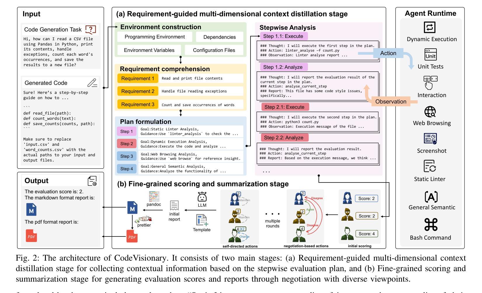 - CodeVisionary是一个创新的、基于代理的评估框架,用于复杂代码生成,包含多维上下文提炼和精细评分总结两个阶段。