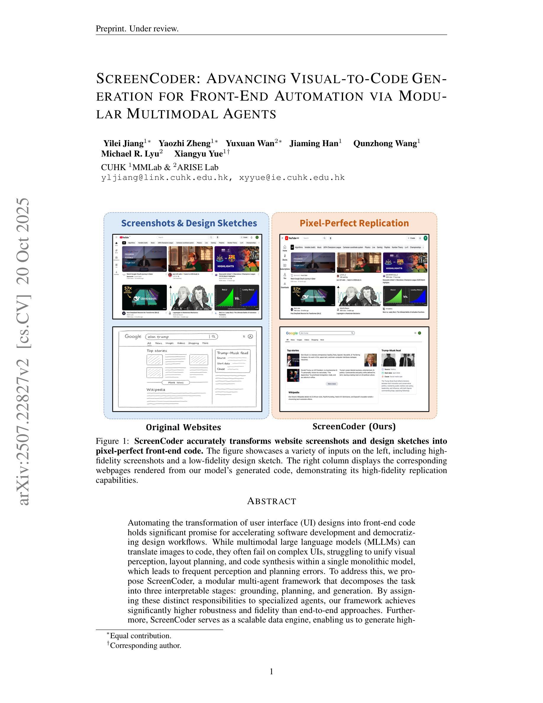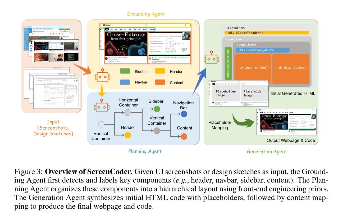 自动化将用户界面(UI)设计转化为前端代码具有加速软件开发和普及设计工作流程的巨大潜力。然而,多模态大型语言模型(MLLMs)在复杂UI的翻译上经常失败,难以在一个单一模型中统一视觉感知、布局规划和代码合成,导致频繁的感知和规划错误。为解决这一问题,我们提出了ScreenCoder,这是一个模块化多智能体框架,将任务分解为可解释的三个阶段:接地、规划和生成。通过将这些特定职责分配给专用智能体,我们的框架比端到端方法实现了更高的鲁棒性和保真度。此外,ScreenCoder还是一个可扩展的数据引擎,能够生成高质量的图片-代码对。我们使用这些数据对开源MLLM进行微调,通过监督精细调整和双阶段强化学习管道,证明其在UI生成能力上的显著增长。