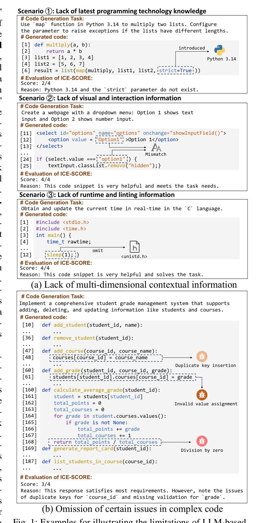- 基于大型语言模型的评估方法一般通过静态提示来评估生成的代码,对于涉及多个要求和需要更多上下文信息的复杂代码场景往往表现不佳。