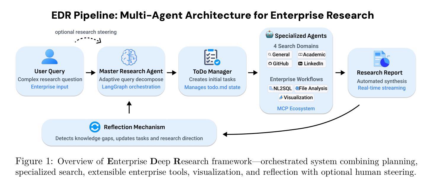 随着信息呈指数级增长,企业面临着将非结构化数据转化为连贯、可操作的见解的巨大压力。虽然自主代理系统显示出潜力,但它们往往在处理特定领域的细微差别、意图对齐和企业集成方面遇到困难。我们推出了企业深度研究(EDR)系统,这是一个多代理系统,它集成了(1)用于自适应查询分解的主规划代理,(2)四个专业搜索代理(通用、学术、GitHub、LinkedIn),(3)一个可扩展的基于MCP的工具生态系统,支持NL2SQL、文件分析和企业工作流程,(4)一个用于数据驱动见解的可视化代理,(5)一种检测知识差距并更新研究方向的反思机制,还可选择人类参与循环指导。这些组件可实现自动化报告生成、实时流和无缝企业部署,已在内部数据集上得到验证。在包括DeepResearch Bench和DeepConsult在内的开放基准测试中,EDR的表现优于最新的代理系统,无需人工指导。我们发布EDR框架和基准轨迹,以推动多代理推理应用的研究。代码位于https://github.com/SalesforceAIResearch/enterprise-deep-research,数据集位于https://huggingface.co/datasets/Salesforce/EDR-200。
