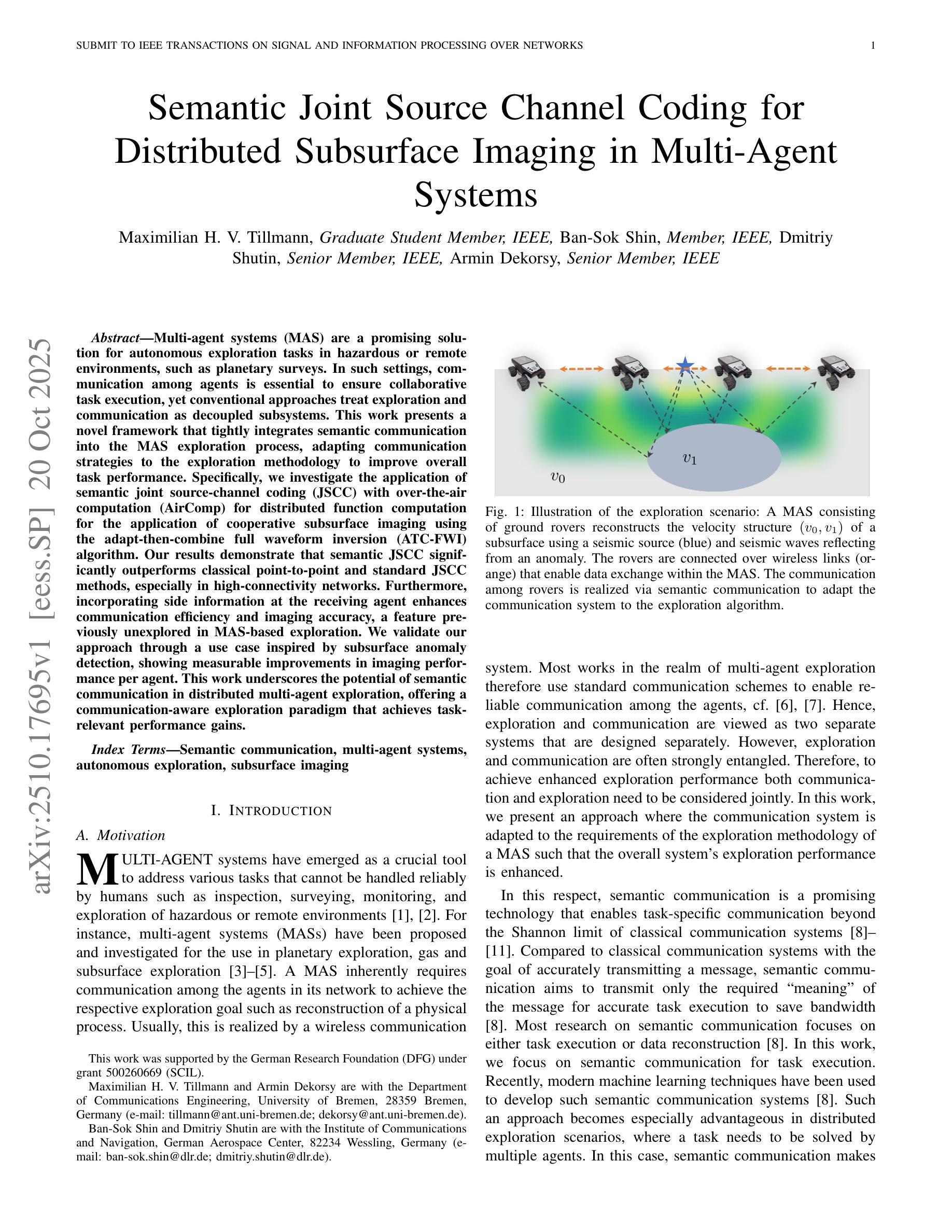 多智能体系统(MAS)在危险或远程环境的自主探索任务中具有广阔的应用前景,如行星勘测。在该环境中,确保协同任务执行的跨智能体通信至关重要。本研究提出了一种新型框架,将语义通信紧密集成到MAS探索过程中,根据探索方法调整通信策略,以提高整体任务性能。此外,本研究调查了语义联合源信道编码与空中计算的结合应用,对基于协同成像的地震波形进行分布函数计算,以模拟感知信号的结果。结果显示,语义联合源信道编码显著优于传统的点对点和标准联合源信道编码方法,特别是在高连通性网络中。此外,接收智能体侧信息的加入提高了通信效率和成像精度,这在基于MAS的探索中是前所未有的。本研究通过模拟地下异常检测的应用案例验证了方法的有效性,实现了每个智能体的成像性能提升。本研究强调了语义通信在分布式多智能体探索中的潜力,为沟通感知探索范式提供了实现任务相关性能增益的途径。