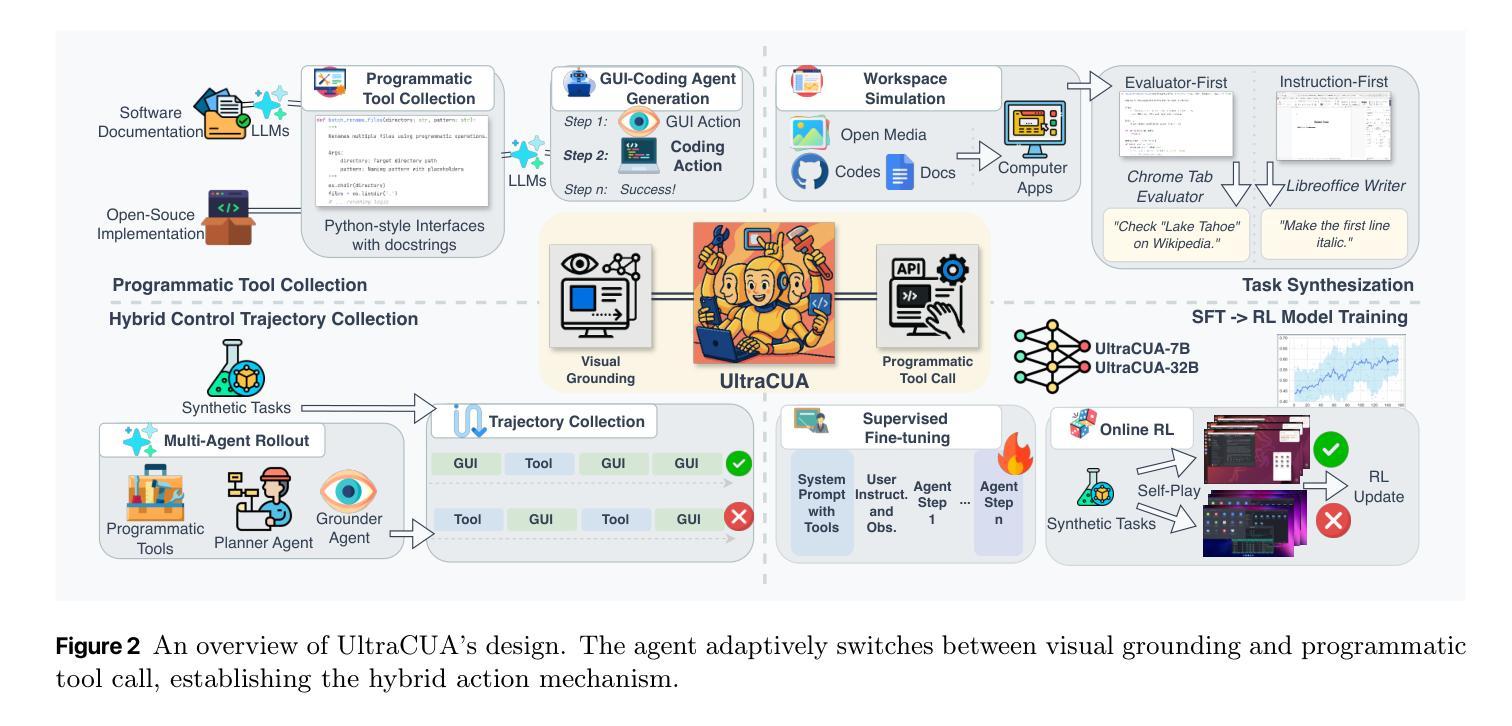 多模态计算机使用代理仅依赖于原始动作(点击、键入、滚动),这些动作需要准确的视觉定位以及冗长的执行链,导致连续失败和执行瓶颈。而其他代理则利用丰富的程序接口(API、MCP服务器、工具),计算机使用代理(CUAs)仍然与这些功能相隔离。我们提出了UltraCUA,这是一个基础模型,它通过混合动作来弥合这一鸿沟——无缝地集成了GUI原始元素和高级程序工具调用。为实现这一目标,我们的方法包括四个关键组成部分:(1)自动化管道,可从软件文档、开源仓库和代码生成中扩展程序工具;(2)合成数据引擎,生成超过17,000项可验证的任务,涵盖现实计算机使用场景;(3)大规模高质量混合动作轨迹收集,包括低级的GUI动作和高级的程序工具调用;(4)两阶段训练管道,结合监督微调与在线强化学习,能够在低级和高级动作之间进行战略切换。使用我们规模为7B和32B的模型进行的实验表明,与最先进的代理相比有重大改进。在OSWorld上,UltraCUA模型相对于基础模型平均提高了22%的相对性能,同时在步骤上提高了11%的执行速度。在WindowsAgentArena上的域外评估显示,我们的模型达到了21.7%的成功率,超越了那些在Windows数据上训练的基线模型。混合动作机制证明是关键的,在减少错误传播的同时保持了执行效率。