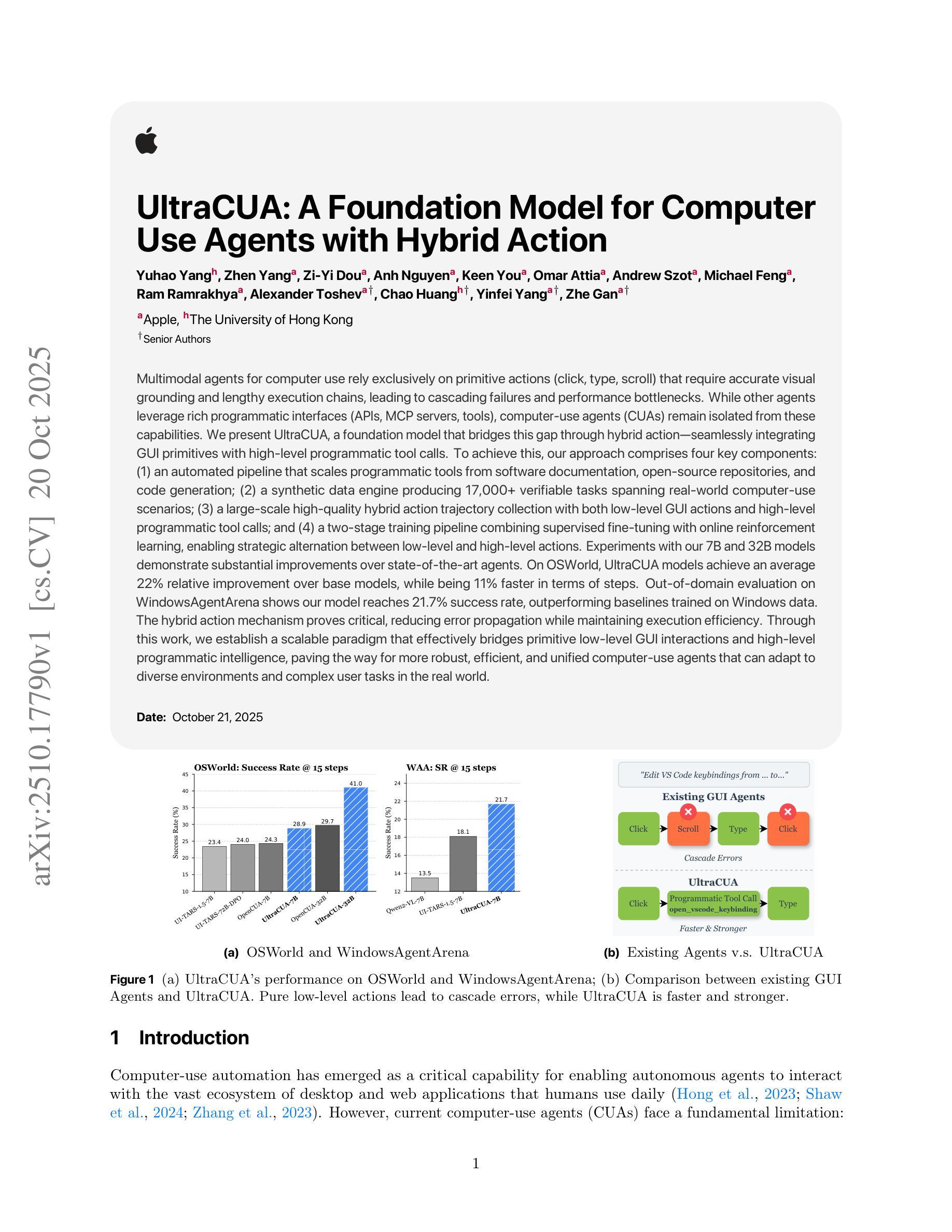 本文介绍了UltraCUA,一个基础模型,它通过混合行动桥接了计算机使用代理(CUAs)与程序化工具的鸿沟。该模型集成了GUI原始元素与高级程序工具调用,包括自动化管道、合成数据引擎、大规模高质量混合行动轨迹收集以及两阶段训练管道。实验证明,该模型相较于当前主流模型有明显提升,如在OSWorld上的平均相对改进率高达22%,步骤效率提升11%。混合行动机制对于减少错误传播并保持执行效率至关重要。