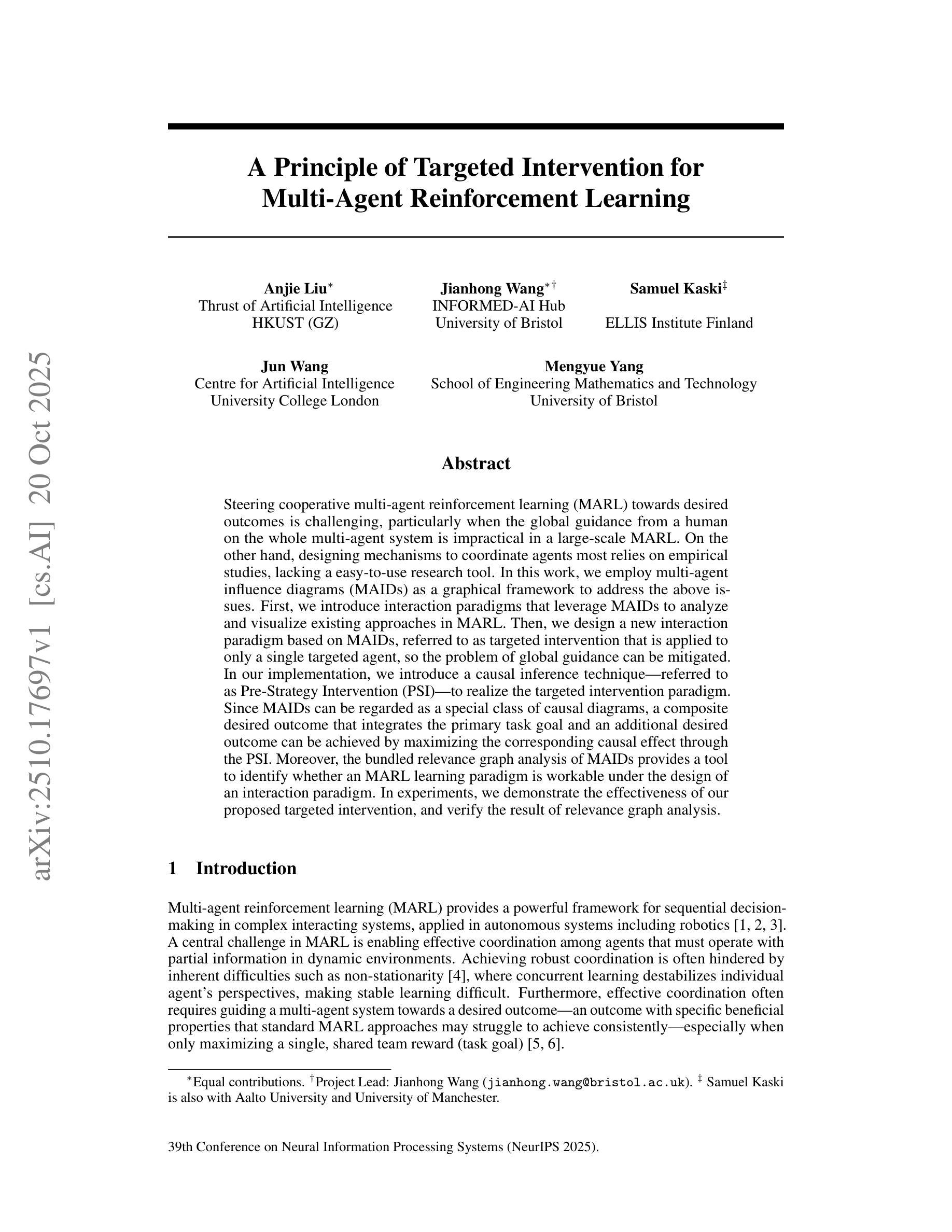 本文利用多智能体影响图(MAIDs)作为图形框架来解决大规模多智能体强化学习(MARL)中的协调问题。通过引入MAIDs的交互范式,分析和可视化现有MARL方法。设计了一种基于MAIDs的新交互范式——目标干预,仅应用于单个目标智能体,减轻全局指导的问题。利用因果推断技术实现目标干预,即预策略干预(PSI)。通过MAIDs的捆绑关联图分析确定智能体学习模式的有效性。实验结果证明了目标干预和关联图分析的有效性。