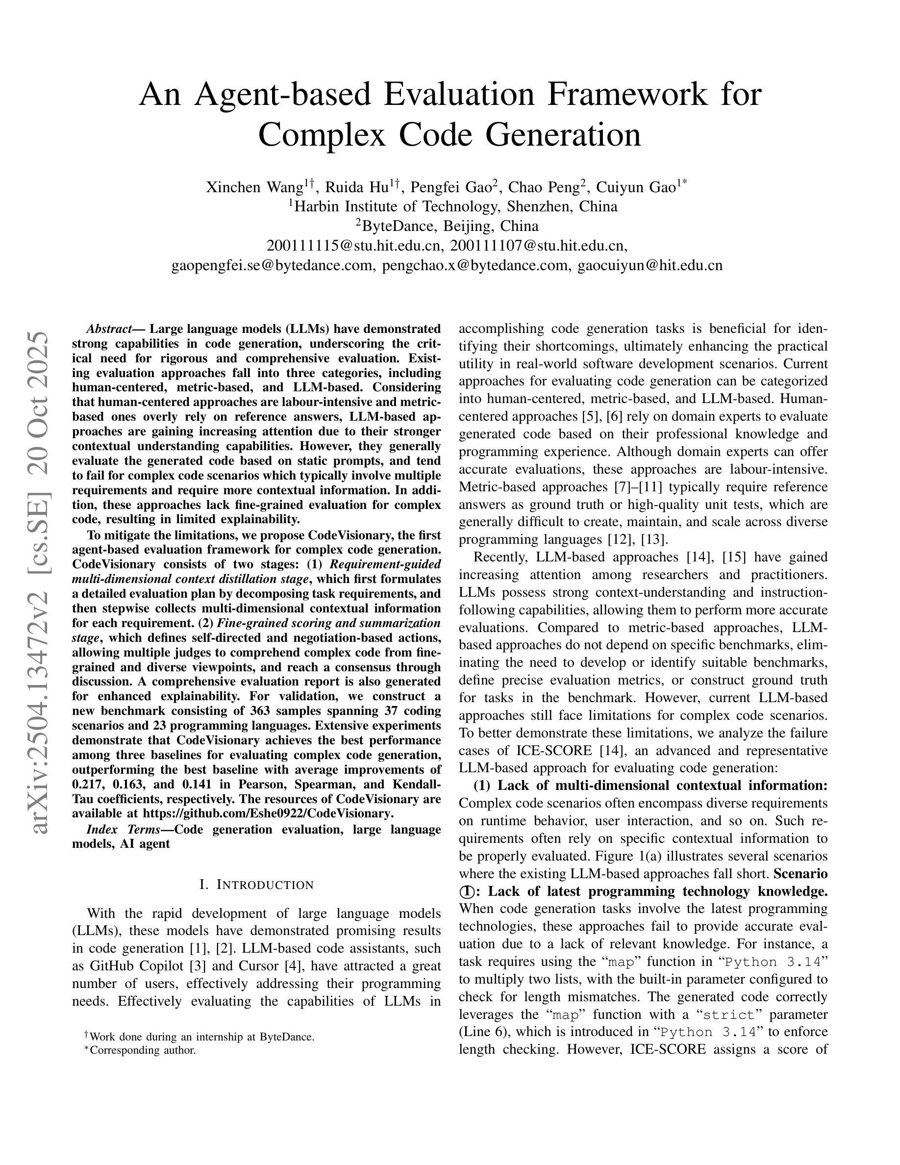 大型语言模型(LLMs)在代码生成方面展现出强大的能力,这强调了进行严格和全面评估的迫切需求。现有的评估方法可分为三类,包括以人类为中心的方法、基于指标的方法和基于LLM的方法。考虑到以人类为中心的方法劳动强度大,而基于指标的方法过度依赖参考答案,基于LLM的方法由于其更强的上下文理解能力而越来越受到关注。然而,它们通常基于静态提示对生成的代码进行评估,对于涉及多个要求和需要更多上下文信息的复杂代码场景,往往会出现失败。此外,这些方法对复杂代码的精细评估不足,导致解释性有限。为了缓解这些限制,我们提出了CodeVisionary,这是第一个用于复杂代码生成的基于代理的评估框架。CodeVisionary由两个阶段组成:(1)要求引导的多维度上下文提炼阶段和(2)精细评分和总结阶段。我们还生成了综合评估报告,以增强解释性。为了验证,我们构建了一个新的基准测试,包含363个样本,涵盖37个编码场景和23种编程语言。大量实验表明,CodeVisionary在评估复杂代码生成方面优于其他三种基线方法,在Pearson、Spearman和Kendall-Tau系数上分别平均提高了0.217、0.163和0.141。CodeVisionary的资源可访问https://github.com/Eshe0922/CodeVisionary了解。