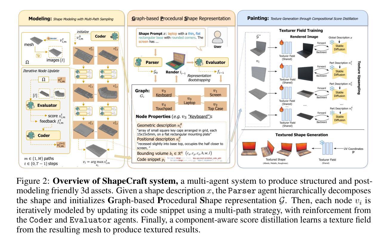 基于自然语言的三维生成技术潜力巨大,有助于减少专家手动建模工作量,提高三维资源的可及性。然而,现有方法常常生成结构混乱的网格,交互性差,难以满足艺术创作需求。为解决这些问题,我们提出ShapeCraft这一新型多智能体框架,用于文本到三维的生成。其核心是图形程序化形状(GPS)表示法,它将复杂的自然语言分解为子任务的结构化图形,促进大型语言模型对空间关系和语义形状细节的理解和解释。智能体通过层次解析用户输入来初始化GPS,然后迭代优化程序建模和绘画,生成结构化、有纹理和交互性的三维资源。实验证明,ShapeCraft在生成几何精确、语义丰富的三维资产方面表现优于现有大型语言模型智能体。同时,通过动画和用户自定义编辑的示例展示了ShapeCraft的通用性,凸显其在更广泛的交互应用中的潜力。
