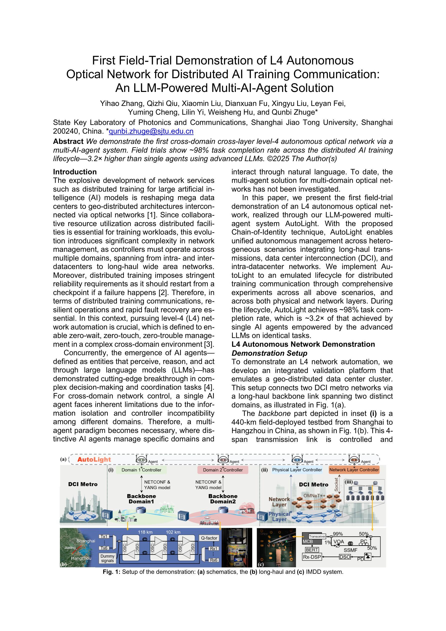 我们通过多智能体系统展示了首个跨域跨层第4级自主光学网络。现场试验表明,在分布式人工智能训练生命周期中,任务完成率约为98%,比使用最新大型语言模型的单个智能体的任务完成率高出3.2倍。