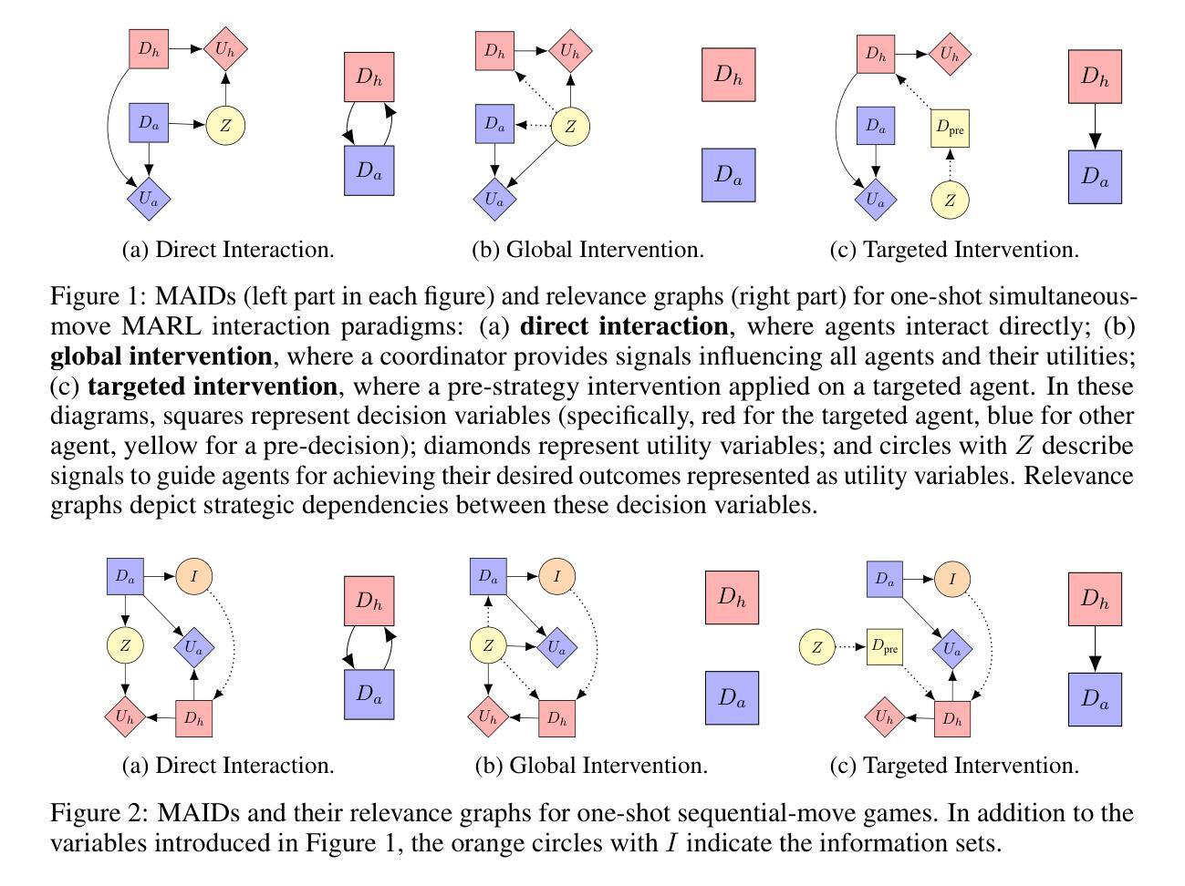 在多智能体强化学习(MARL)中,向期望的结果引导合作是一项挑战,特别是在大规模MARL中,对整个多智能体系统进行人的全局指导并不实际。另一方面,设计协调智能体的机制主要依赖于实证研究,缺乏易于使用的研究工具。在这项工作中,我们采用多智能体影响图(MAIDs)作为图形框架来解决上述问题。首先,我们介绍了利用MAIDs分析可视化MARL中现有方法的信息交互范例。然后,我们基于MAIDs设计了一种新的交互范例,称为有针对性的干预,该范例仅适用于单个目标智能体,从而可以缓解全局指导的问题。在我们的实现中,引入了一种因果推理技术——预策略干预(PSI)——来实现有针对性的干预范例。由于MAIDs可以被视为因果图的一个特殊类别,因此可以通过PSI最大化相应的因果效应来实现集成主要任务目标和附加期望结果的综合期望结果。此外,MAIDs的捆绑关联图分析提供了一种工具,可以确定在特定的交互设计下,一种MARL学习范式是否可行。在实验方面,我们验证了所提出的有针对性的干预措施的有效性,并验证了关联图分析的结果。
