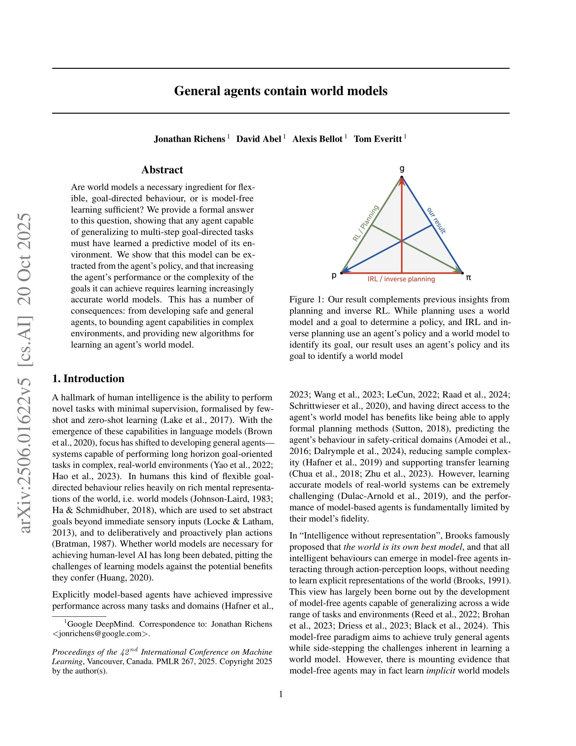 Are world models a necessary ingredient for flexible, goal-directed behaviour, or is model-free learning sufficient? We provide a formal answer to this question, showing that any agent capable of generalizing to multi-step goal-directed tasks must have learned a predictive model of its environment. We show that this model can be extracted from the agent’s policy, and that increasing the agents performance or the complexity of the goals it can achieve requires learning increasingly accurate world models. This has a number of consequences: from developing safe and general agents, to bounding agent capabilities in complex environments, and providing new algorithms for eliciting world models from agents.