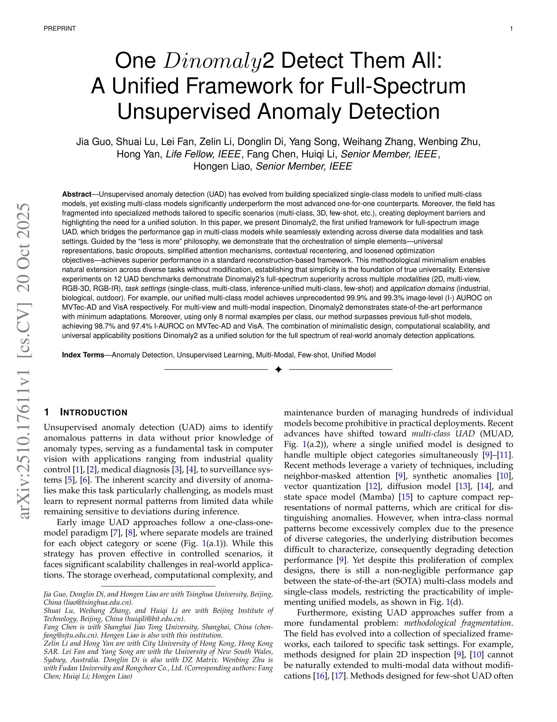 无监督异常检测(UAD)已经从构建专门单类模型发展到统一多类模型,但现有多类模型显著落后于最先进的一对一个模型。此外,该领域已经细分为针对特定场景(多类、三维、小样本等)的专用方法,造成了部署障碍并凸显了对统一解决方案的需求。在本文中,我们提出了Dinomaly2,这是首个用于全频谱图像UAD的统一框架,它缩小了多类模型的性能差距,同时无缝地扩展到不同的数据模式和任务设置。秉承“少即是多”的理念,我们证明了五种简单元素的协同能在标准的重建框架中达到卓越的性能。这种方法论上的简约性使得跨不同任务的自然扩展成为可能,而无需进行修改,证明了简约性是真正普遍性的基础。在12个UAD基准测试上的广泛实验表明,Dinomaly2在多模式(二维、多视角、RGB-3D、RGB-IR)、任务设置(单类、多类、推理统一多类、小样本)和应用领域(工业、生物、户外)中具有全频谱优势。例如,我们的多类模型在MVTec-AD和VisA上分别实现了前所未有的99.9%和99.3%的图像级(I-)AUROC。对于多视角和多模式检查,Dinomaly2在最少调整的情况下展示了最先进的性能。而且,每个类别仅使用8个正常样本,我们的方法就超越了之前的全镜头模型,在MVTec-AD和VisA上分别实现了98.7%和97.4%的I-AUROC。结合简约设计、计算可扩展性和通用适用性,Dinomaly2成为全频谱现实世界异常检测应用的统一解决方案。