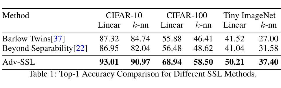 - Adv-SSL在多个基准数据集上的性能优于现有方法。