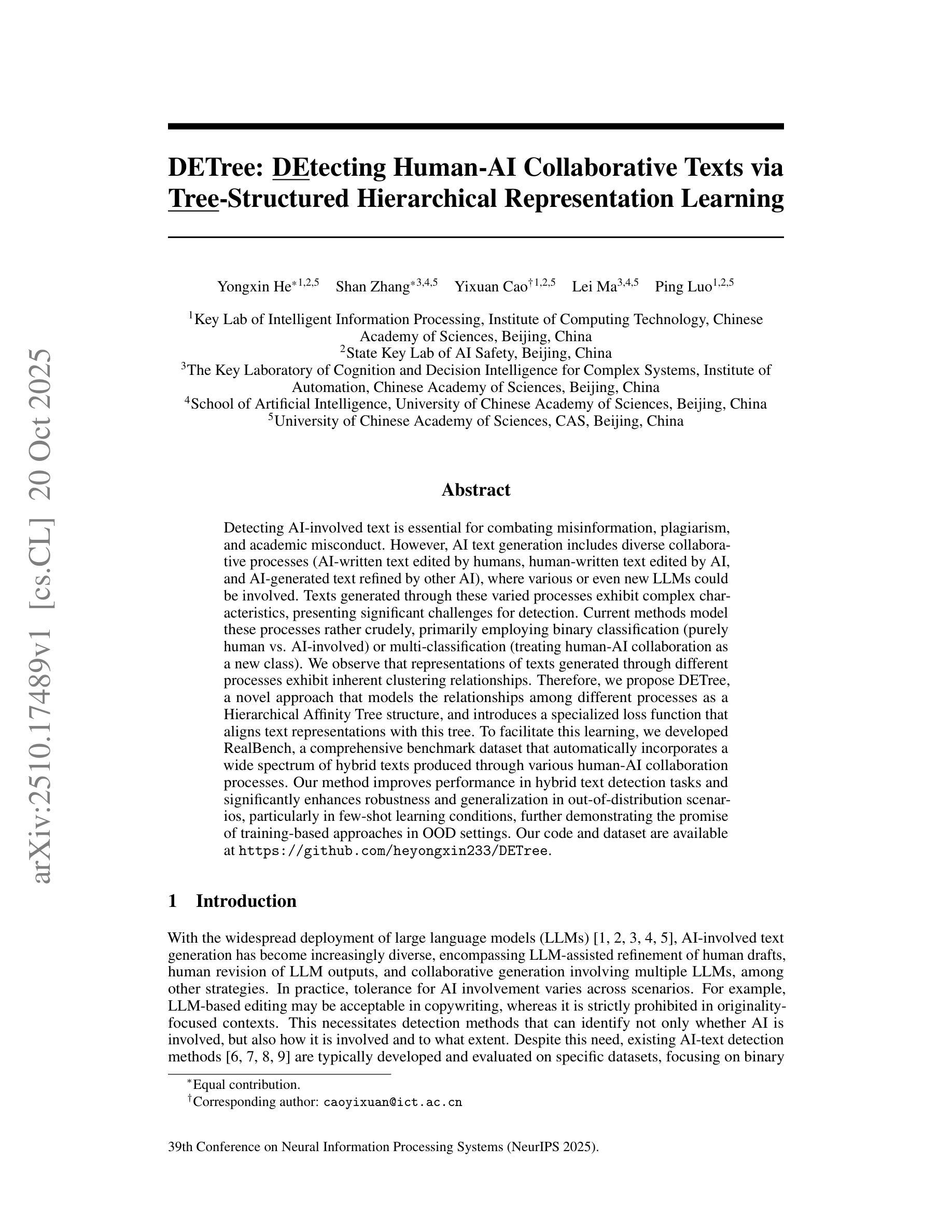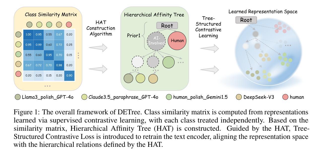 检测涉及人工智能的文本对于打击虚假信息、抄袭和学术不端行为至关重要。然而,人工智能文本生成包括多种协作过程(人工智能撰写的文本由人类编辑、人类撰写的文本由人工智能编辑、以及由其他人工智能完善的人工智能生成文本),其中可能涉及各种甚至是新型的大型语言模型。通过这些不同过程生成的文本表现出复杂的特性,为检测带来了重大挑战。当前的方法对这些过程的建模较为粗糙,主要采用二分类(纯粹的人类创作与人工智能参与)或多分类(将人机协作视为一个新类别)。我们观察到,通过不同过程生成的文本表示呈现出固有的聚类关系。因此,我们提出了DETree这一新方法,它将不同过程之间的关系建模为分层亲和树结构,并引入了一种专用的损失函数,使文本表示与此树对齐。为了促进这一学习,我们开发了RealBench综合基准数据集,该数据集可自动包含通过各种人机协作过程产生的广泛混合文本。我们的方法在混合文本检测任务上提高了性能,并在离群分布场景中显著增强了稳健性和泛化能力,特别是在小样本学习条件下,进一步证明了基于训练的方法在OOD环境中的潜力。我们的代码和数据集可通过https://github.com/heyongxin233/DETree获取。