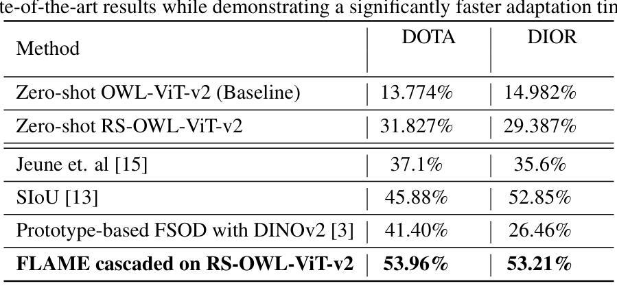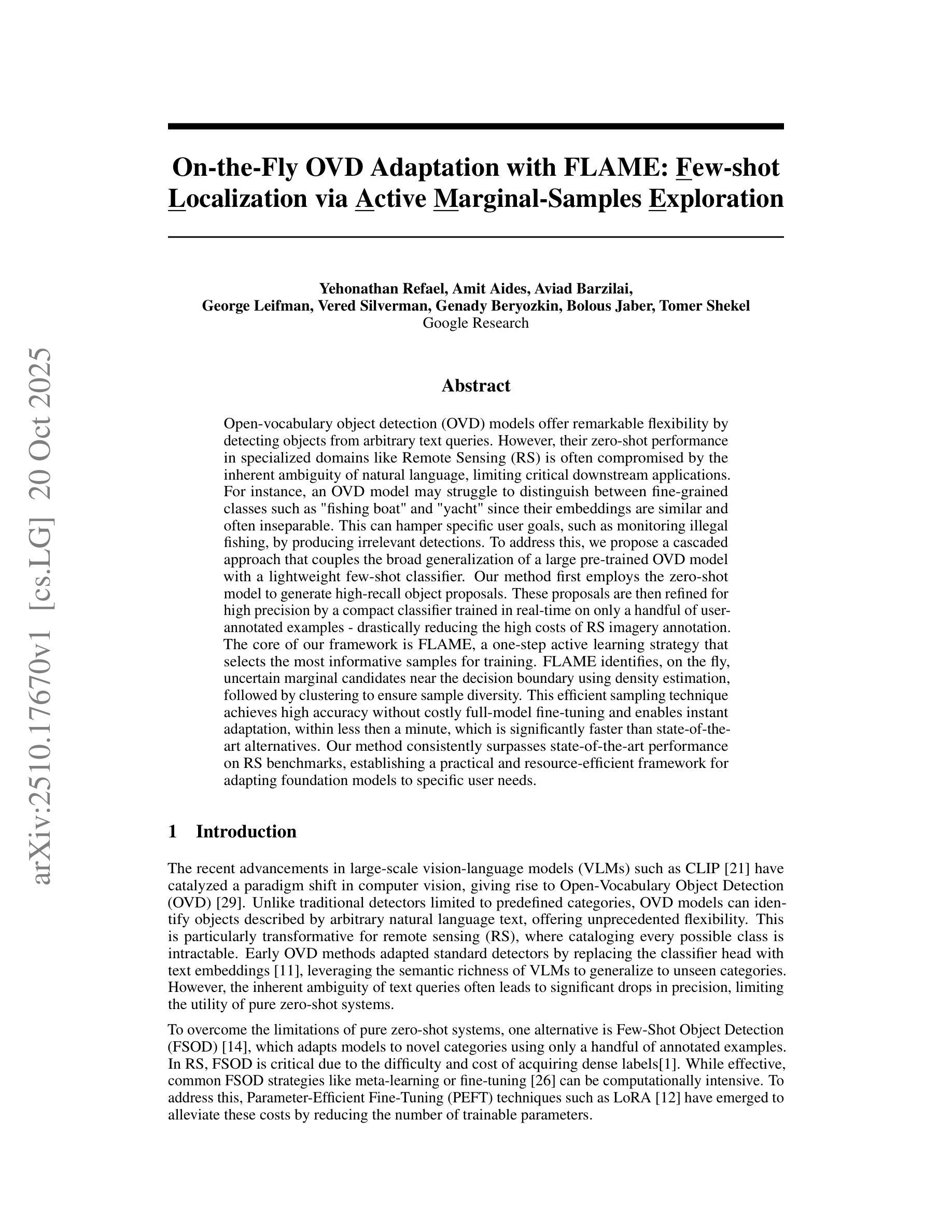 开放词汇对象检测(OVD)模型通过从任意文本查询中检测对象,提供了惊人的灵活性。然而,它们在遥感(RS)等特定领域的零样本性能通常受到自然语言固有模糊性的限制,从而影响关键下游应用程序的应用。例如,OVD模型可能在区分精细类别(如“渔船”和“游艇”)时遇到困难,因为它们的嵌入相似且通常无法区分。这可能会阻碍特定的用户目标,例如通过产生无关的检测结果来监测非法捕鱼。为了解决这一问题,我们提出了一种级联方法,将大型预训练OVD模型的广泛泛化与轻量级小样本分类器相结合。我们的方法首先使用零样本模型生成高召回率对象提案。然后,使用仅实时训练少量用户注释的示例的紧凑分类器对这些提议进行精确度的改进,大大降低了遥感图像注释的成本。我们框架的核心是FLAME,这是一种一步式主动学习策略,可选择最具信息量的样本进行训练。FLAME即时识别决策边界附近的不确定边缘候选对象,使用密度估计进行筛选和集群确保样本多样性。这种高效的采样技术无需昂贵的全模型微调即可实现高准确性,并能在不到一分钟的时间内实现即时适应,这明显优于最新的替代方案。我们的方法在遥感基准测试上始终超越最新性能水平,为根据特定用户需求调整基础模型建立了一个实用且资源高效的框架。