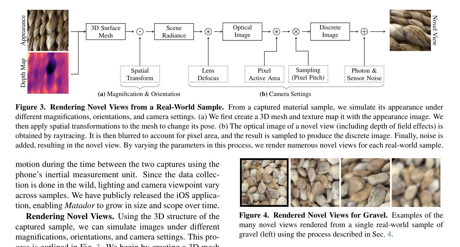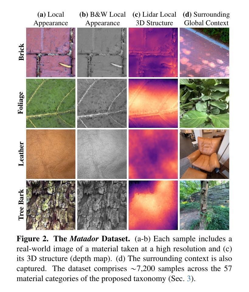 本文提出了一种基于物理特性的材料分类法,用于从局部外观进行层次识别。文章建立了一个多样化的自然场景数据集,包含各类材料的图像和深度图。基于图注意力网络和材料分类法,提出了一种层次材料识别方法。该方法利用类别之间的分类学相关性,实现了先进性能。实验证明,该模型能够推广到恶劣的现实中成像条件,并使用深度图渲染的新视角提升其性能。此外,该模型还展示了在少量样本学习新材料的快速学习能力。