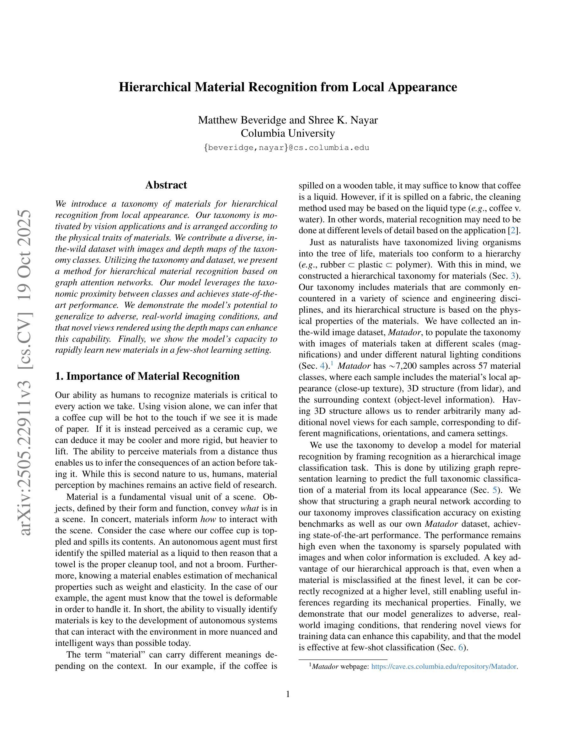 我们介绍了一种基于局部外观进行层次识别的材料分类法。我们的分类法受到视觉应用的启发,并根据材料的物理特征进行排列。我们贡献了一个包含分类图像和深度图的多样化、野外数据集。利用分类法和数据集,我们提出了一种基于图注意力网络的层次材料识别方法。我们的模型利用类之间的分类邻近性,实现了最先进的性能。我们展示了该模型在恶劣的、现实世界的成像条件下的通用化潜力,以及使用深度图呈现的新视角可以增强这种能力。最后,我们展示了该模型在少量学习环境中快速学习新材料的潜力。