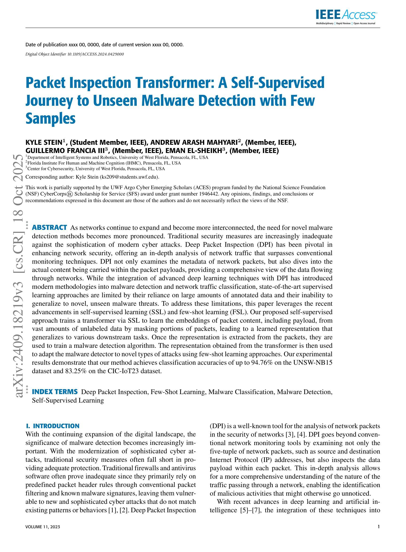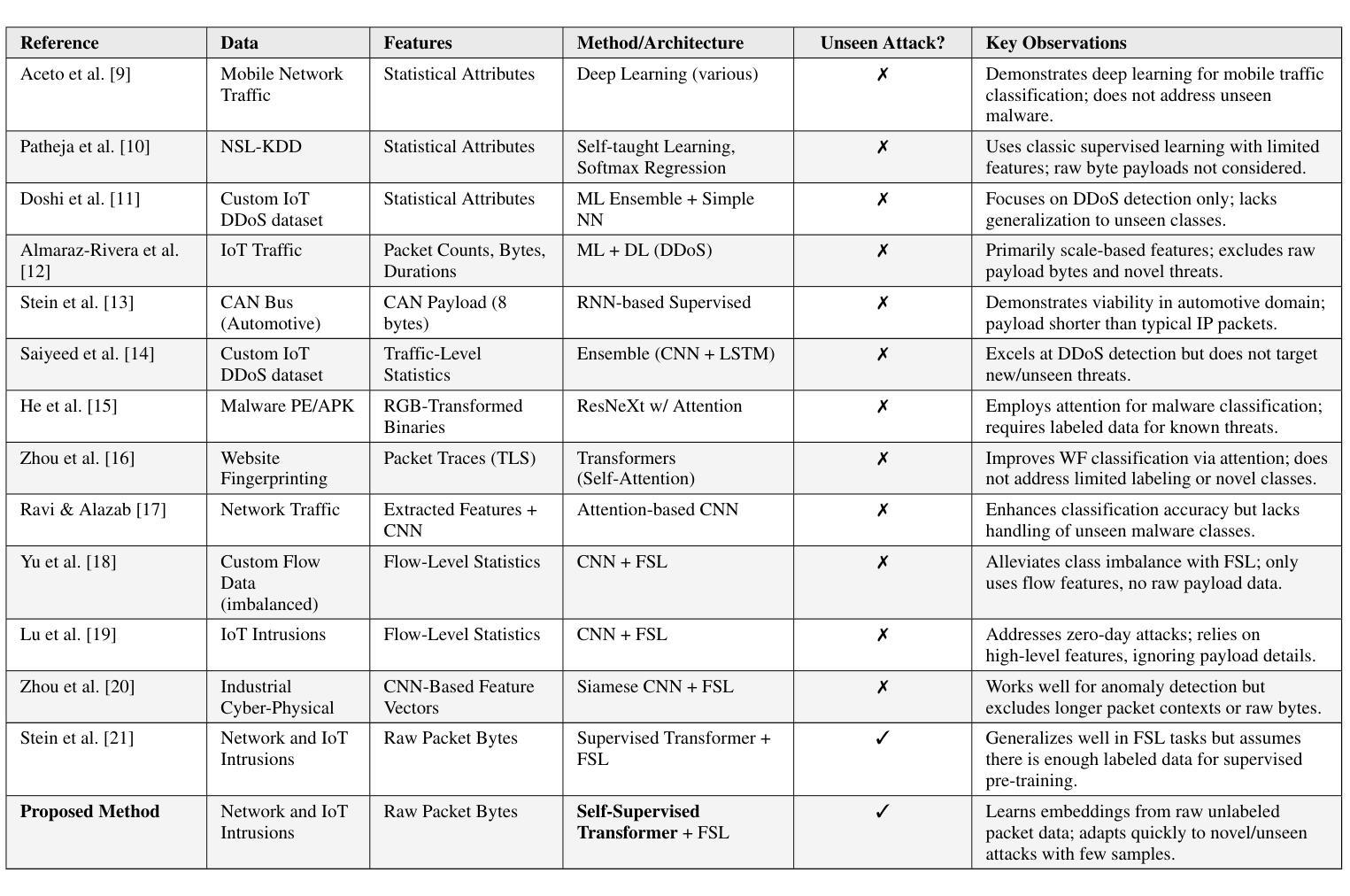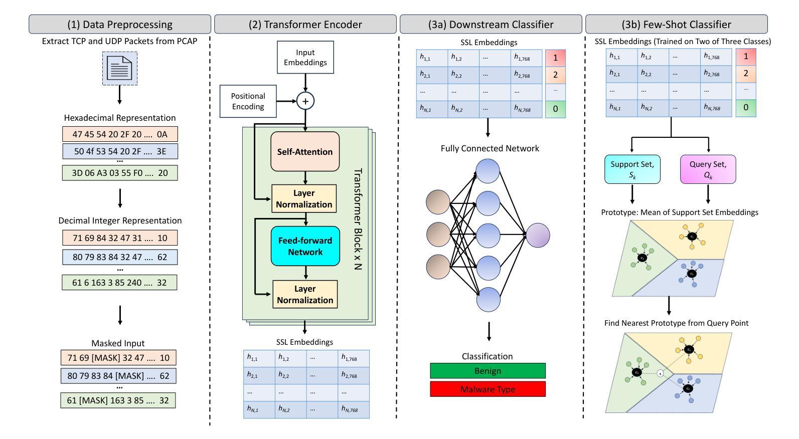 随着网络的不断扩张和相互连接,对新型恶意软件检测方法的需求变得更加迫切。传统的安全措施越来越难以应对现代网络攻击的复杂性。深度包检测(DPI)在增强网络安全方面发挥了关键作用,它提供了对网络流量的深入分析,超越了传统的监控技术。DPI不仅检查网络包的元数据,还深入探究包有效载荷中的实际内容,提供了流经网络的数据的全面视图。虽然将先进的深度学习技术与DPI相结合已经为恶意软件检测和网络流量分类引入了现代方法,但最先进的监督学习方法受限于它们对大量标注数据的依赖,以及它们无法推广到新型未见过的恶意软件威胁。为了解决这个问题,本文利用自我监督学习(SSL)和少镜头学习(FSL)的最新进展。我们提出的自我监督方法通过SSL训练一个变压器,学习包括有效载荷在内的数据包内容的嵌入,通过掩盖数据包的部分内容,从大量未标记数据中学习表示形式,这有助于适应各种下游任务。一旦从数据包中提取出表示形式,它们将被用于训练恶意软件检测算法。从变压器得到的表示形式然后被用于借助少镜头学习方法适应新型攻击类型的恶意软件检测器。我们的实验结果表明,我们的方法在UNSW-NB15数据集上达到了高达94.76%的分类精度,在CIC-IoT23数据集上达到了83.25%的分类精度。