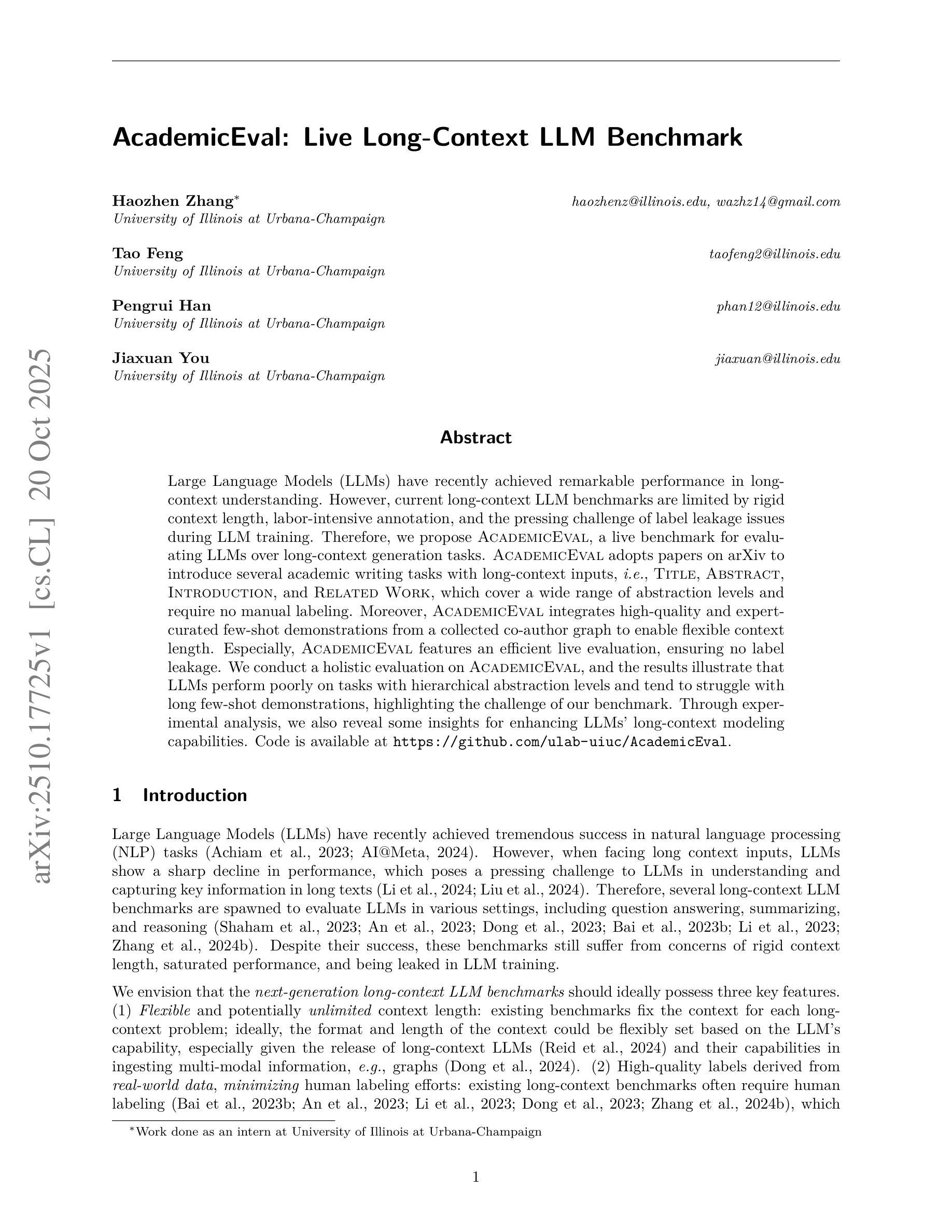 大规模语言模型(LLMs)最近在长上下文理解方面取得了显著的成绩。然而,当前的长上下文LLM基准测试受到严格上下文长度、劳动密集型的标注以及LLM训练过程中标签泄露问题的紧迫挑战。因此,我们提出了\emph{AcademicEval},这是一个用于评估长上下文生成任务中LLMs性能的实时基准测试。AcademicEval采用arXiv上的论文来引入具有长上下文输入的几个学术写作任务,例如\emph{Title}、\emph{Abstract}、\emph{Introduction}和\emph{Related Work},这些任务涵盖了广泛的抽象层次,且无需手动标注。此外,AcademicEval集成了从收集的合著者图中精心挑选的高质量、专家制作的少样本演示,以实现灵活的上下文长度。特别地,AcademicEval具有高效的实时评估功能,确保无标签泄露。我们对AcademicEval进行了全面的评估,结果表明LLMs在处理具有分层抽象层次的任务时表现不佳,并且在面对长的少样本演示时往往感到困难,这突显了我们基准测试的挑战性。通过实验分析,我们还揭示了一些增强LLMs长上下文建模能力的见解。代码可在https://github.com/ulab-uiuc/AcademicEval找到。