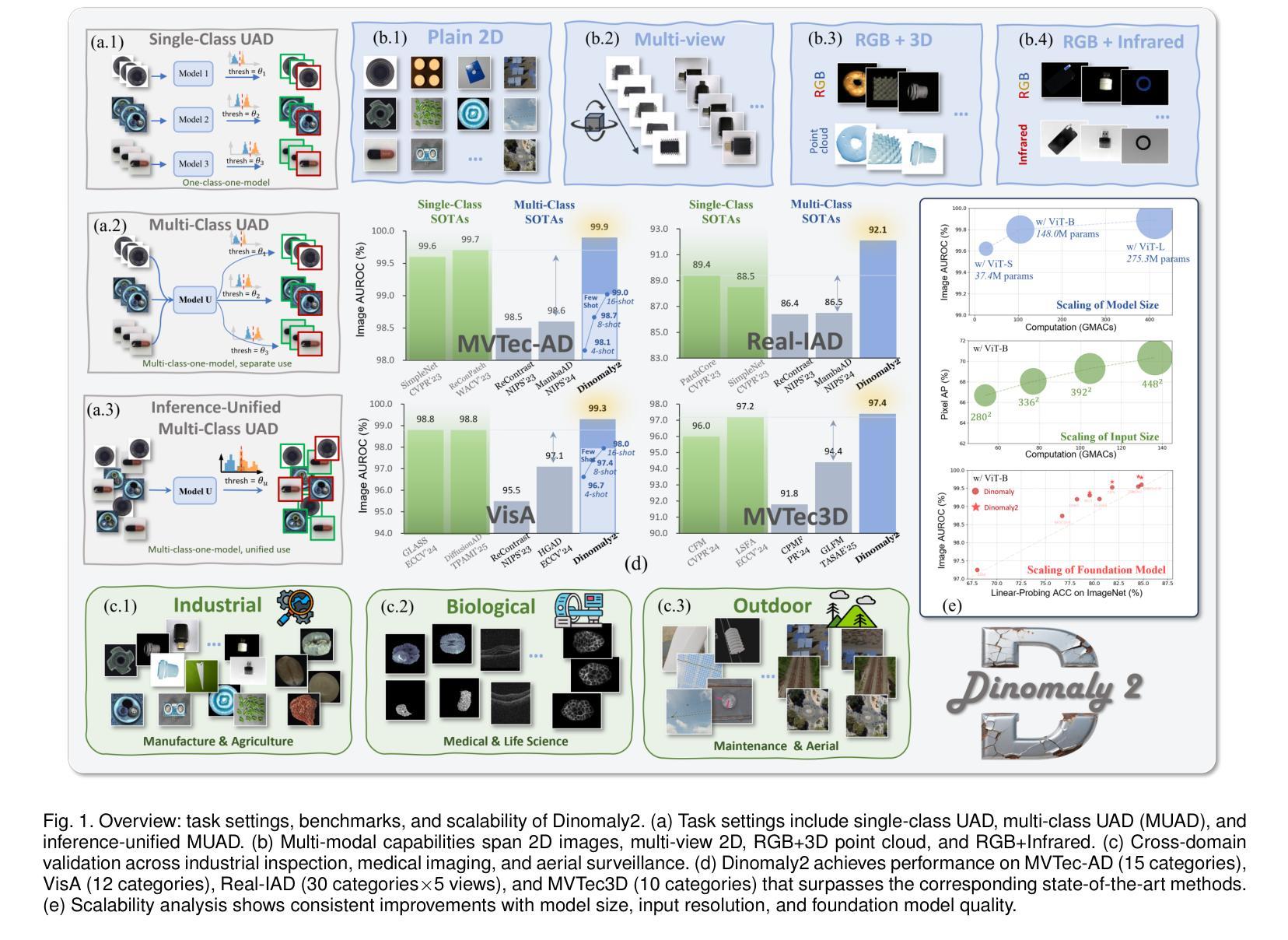 - Dinomaly2具有极简的设计、计算上的可扩展性和普遍适用性,使其成为全频谱现实世界异常检测应用的统一解决方案。