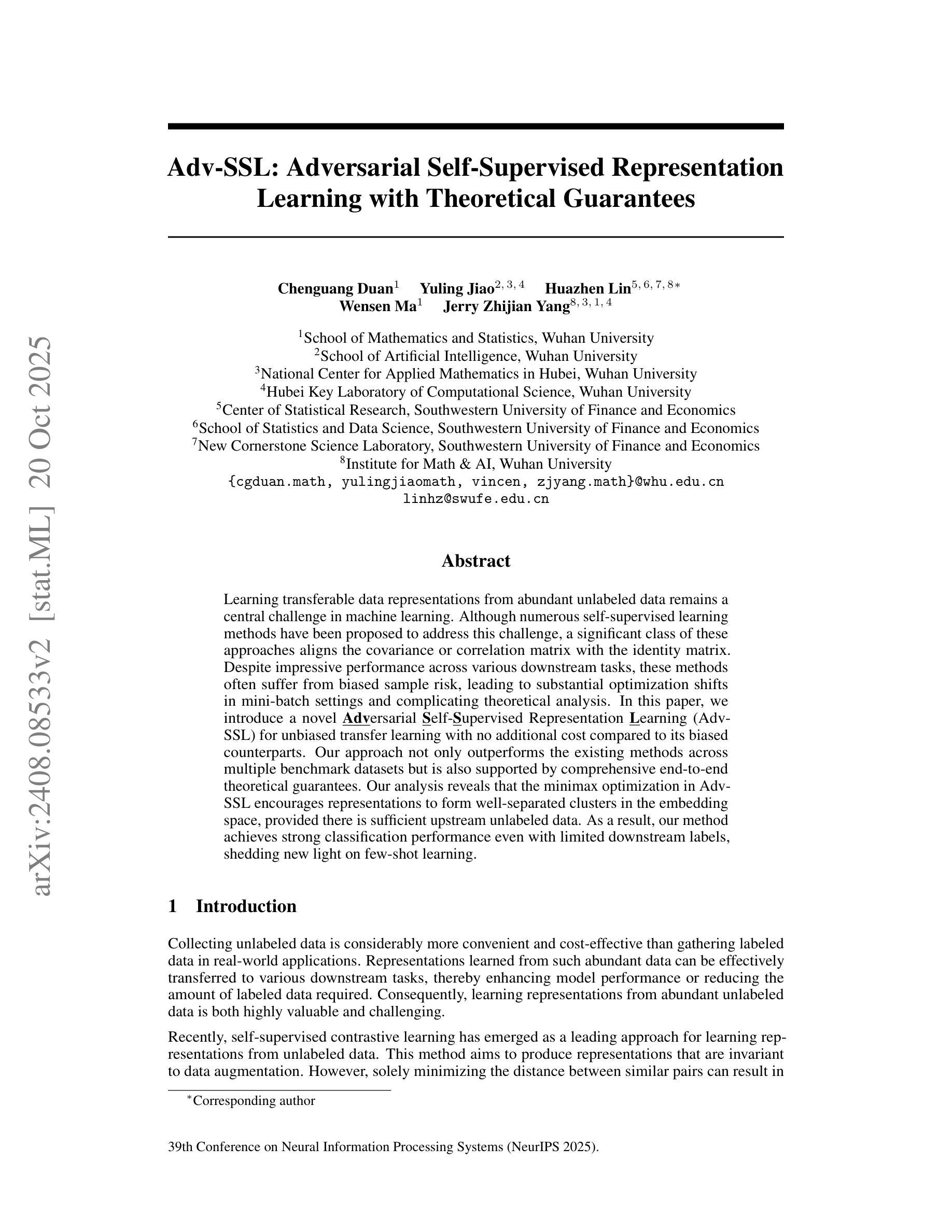 从大量未标记数据中学习可迁移的数据表示仍然是机器学习中的一个核心挑战。尽管已经提出了许多自监督学习方法来解决这一挑战,但其中很大一部分方法是将协方差或相关性矩阵与单位矩阵对齐。尽管在各种下游任务中表现出令人印象深刻的性能,这些方法往往存在样本偏差风险,导致在小型批次设置中出现重大的优化变化,并使得理论分析复杂化。在本文中,我们介绍了一种新型的对抗性自监督表示学习(Adv-SSL),用于无偏迁移学习,与有偏的同类方法相比,无需增加任何成本。我们的方法不仅在多个基准数据集上优于现有方法,而且得到了全面的端到端理论保证的支持。我们的分析表明,Adv-SSL中的最小最大优化鼓励表示在嵌入空间中形成分离良好的聚类,前提是上游有足够的未标记数据。因此,即使下游标签有限,我们的方法也能实现强大的分类性能,为小样学习提供了新的视角。