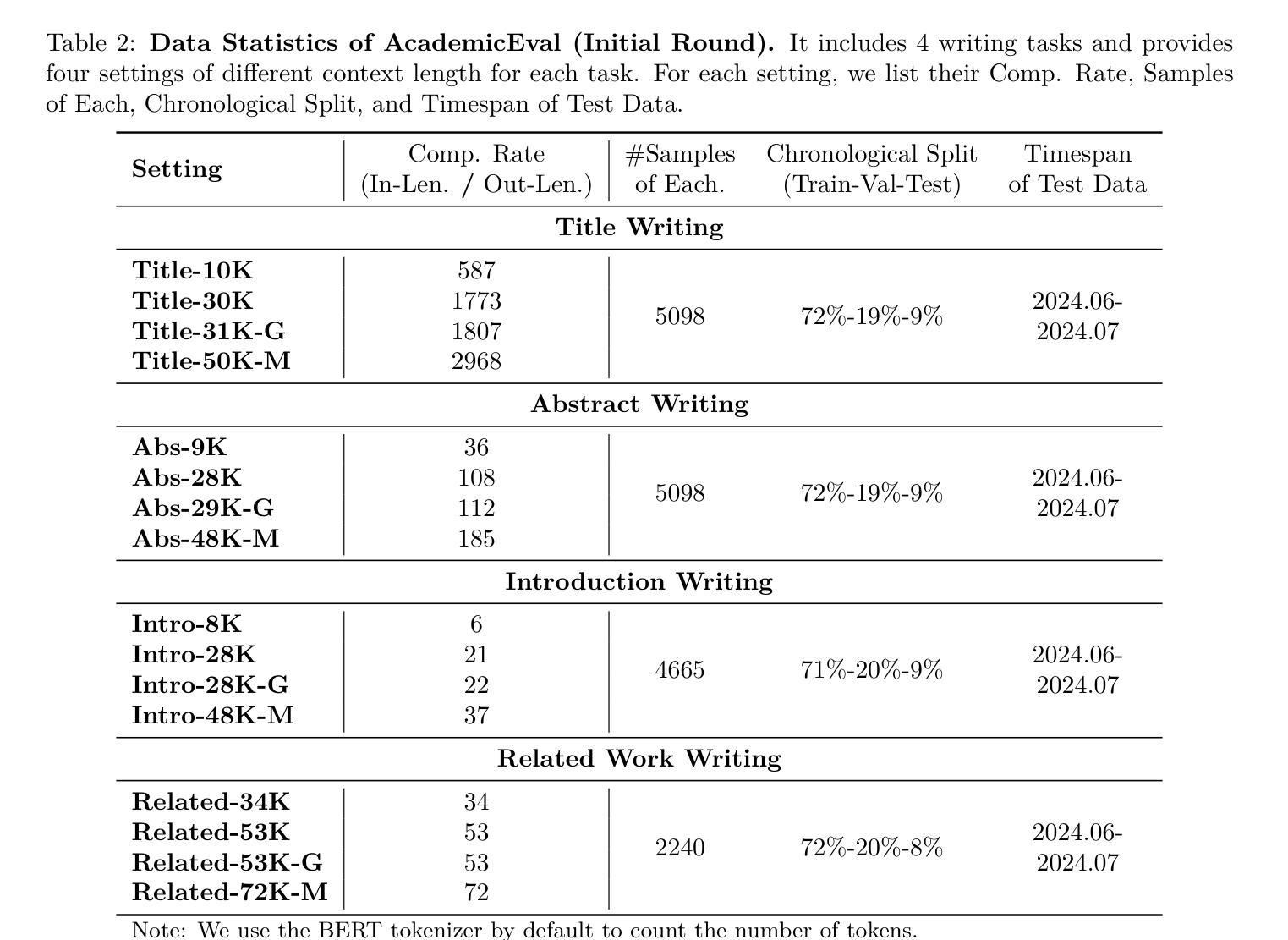 - AcademicEval采用arXiv论文,涵盖多种学术写作任务,包括标题、摘要、介绍和相关工作等,无需手动标注。