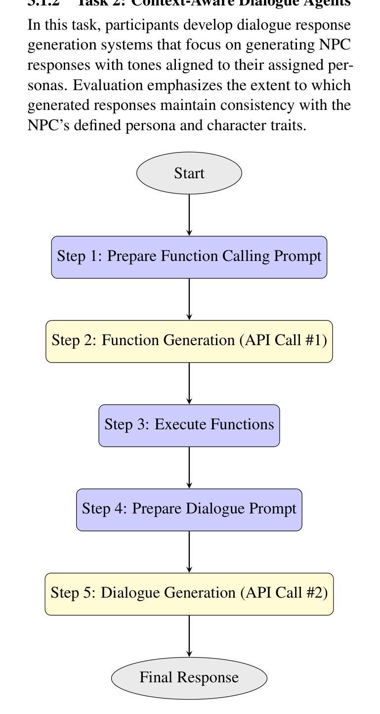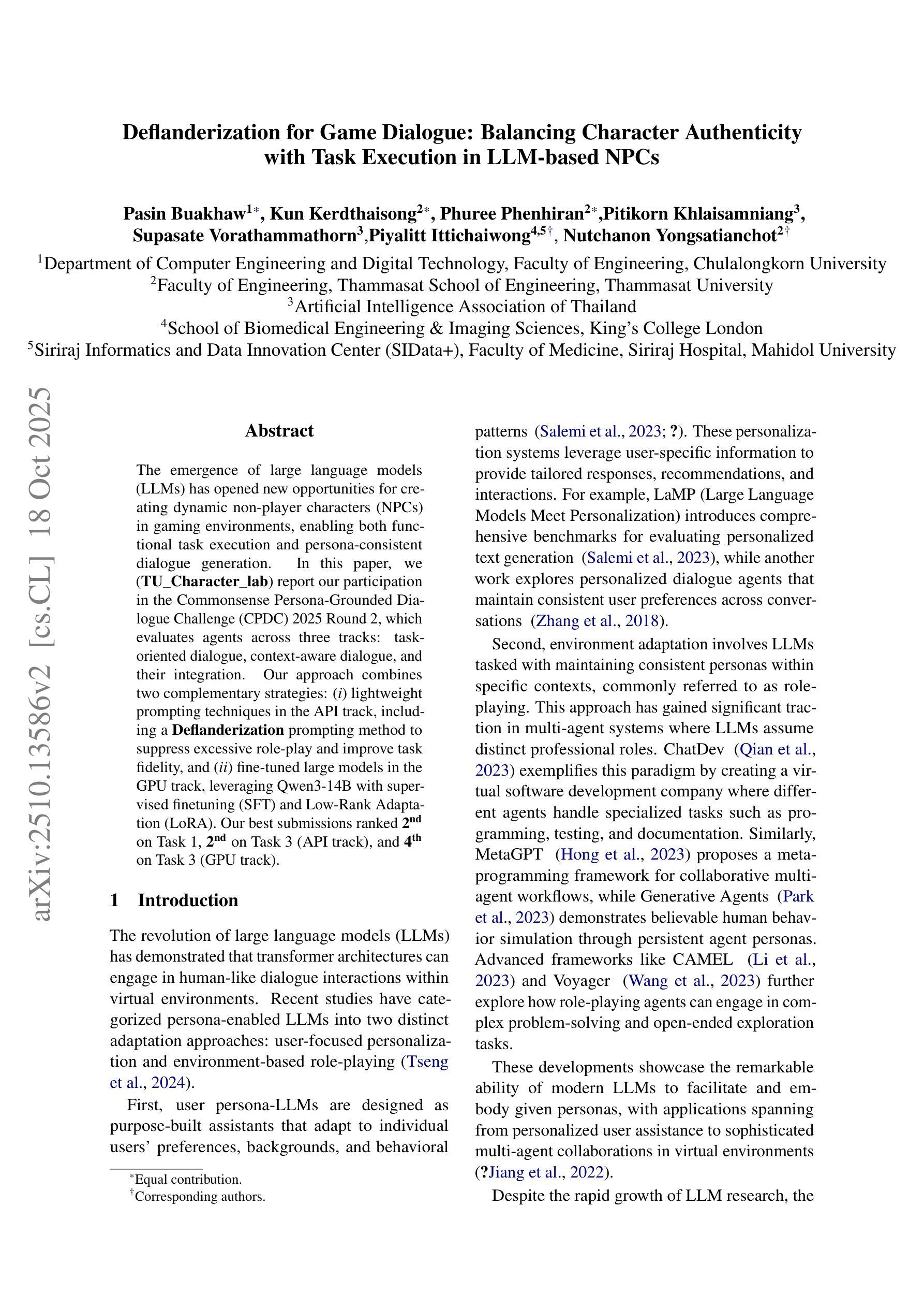 大型语言模型(LLM)的出现为游戏环境中创建动态非玩家角色(NPC)带来了新的机遇,既能够实现功能任务的执行,又能够生成个性一致的对话。我们在本文中(Tu_Character_lab)报告了参加Commonsense Persona-Grounded Dialogue Challenge(CPDC)2025年第二轮的情况,该挑战对代理人在三个领域进行评估:任务导向型对话、语境感知对话以及二者的融合。我们的方法结合了两种互补的策略:(i)API轨迹中的轻量级提示技术,包括一种Deflanderization提示方法,以抑制过多的角色扮演并提高任务保真度;(ii)GPU轨迹中的精细调整大型模型,利用Qwen3-14B进行有监督微调(SFT)和低秩适应(LoRA)。我们的最佳提交在任务1中排名第二,在任务3(API轨迹)中排名第二,在任务3(GPU轨迹)中排名第四。