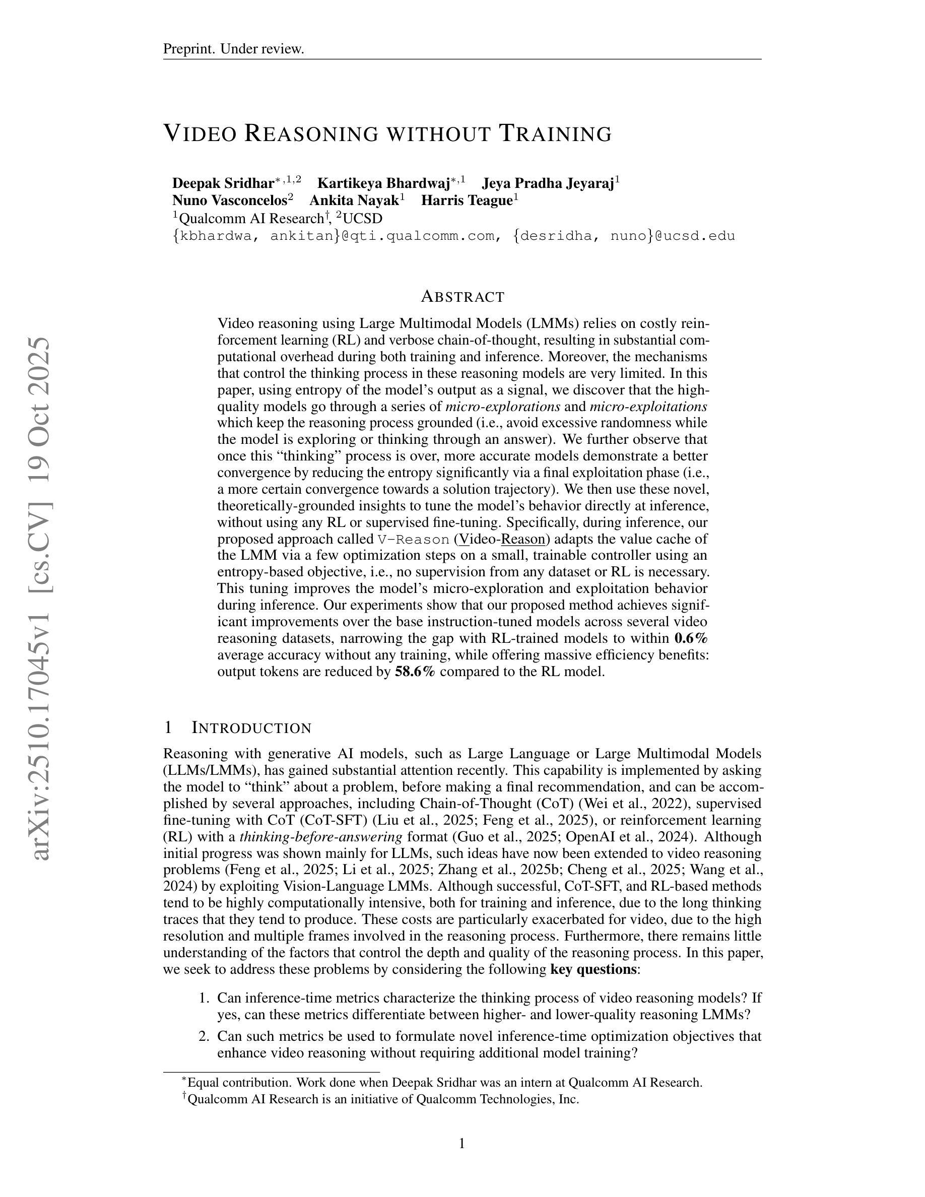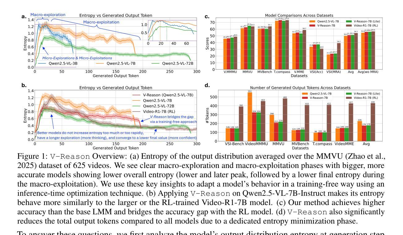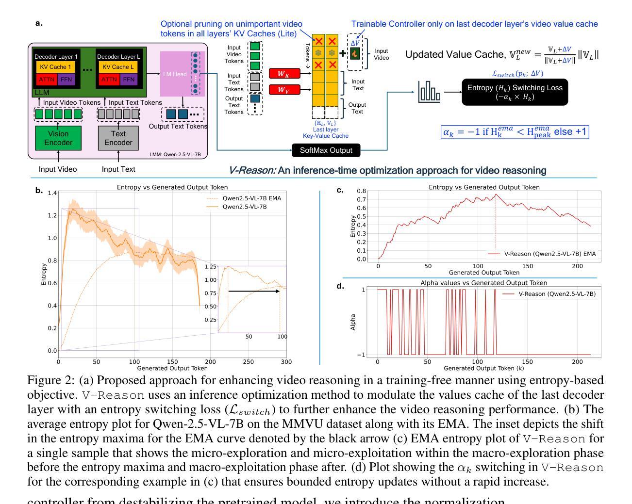 使用大型多模态模型(LMMs)进行视频推理依赖于昂贵的强化学习(RL)和冗长的思维链,导致在训练和推理过程中产生大量的计算开销。而且,这些推理模型控制思维过程的机制非常有限。在本文中,我们以模型输出的熵作为信号,发现高质量模型会经历一系列的微观探索和微观利用,使推理过程保持扎实(即,在模型探索或通过思考寻找答案时避免过度随机性)。我们进一步观察到,一旦“思考”过程结束,更精确的模型会通过最终的利用阶段显著减少熵,从而显示出更好的收敛性(即,更确定地朝向解决方案轨迹)。然后,我们利用这些新的、理论上的见解,直接在推理时调整模型的行为,而无需使用任何RL或监督微调。具体来说,在推理期间,我们提出的名为V-Reason(视频推理)的方法通过几个优化步骤,对LMM的值缓存进行适应,这些优化步骤在一个小型的、可训练的控制器上基于熵的目标进行,即无需任何数据集或RL的监督。这种调整改进了模型在推理过程中的微观探索和利用行为。我们的实验表明,与基于指令调整的基础模型相比,我们的方法在多个视频推理数据集上实现了显著改进,在无需任何训练的情况下,与RL训练模型的平均准确率差距缩小至0.6%,同时带来了巨大的效率效益:与RL模型相比,输出令牌减少了58.6%。