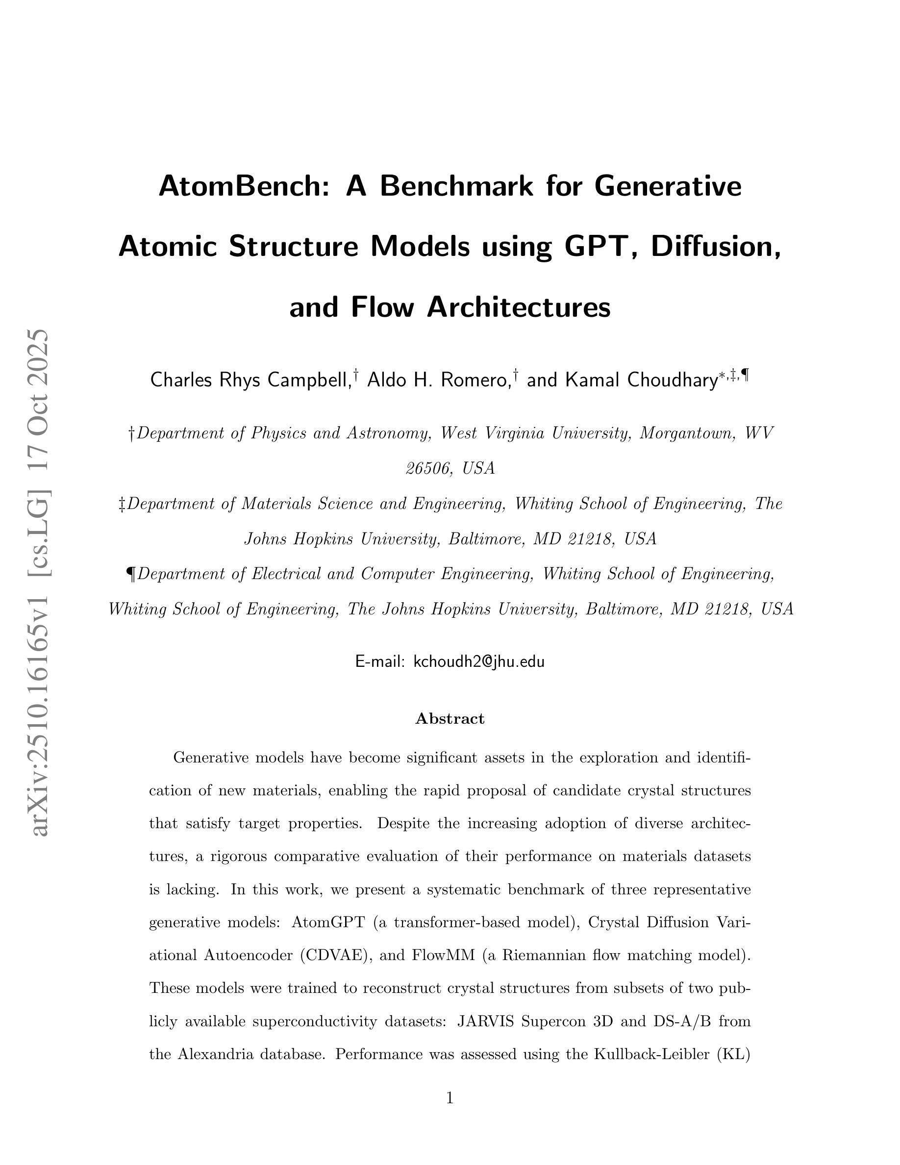 本文介绍了三种代表性生成模型:AtomGPT、Crystal Diffusion Variational Autoencoder(CDVAE)和FlowMM,在材料数据集上的性能系统评估。这些模型被训练用于从公开可用的超导材料数据集中重建晶体结构。通过预测的晶格参数分布与参考分布之间的Kullback-Leibler(KL)散度以及晶格常数的平均绝对误差(MAE)来评估性能。结果显示CDVAE表现最佳,其次是AtomGPT,最后是FlowMM。