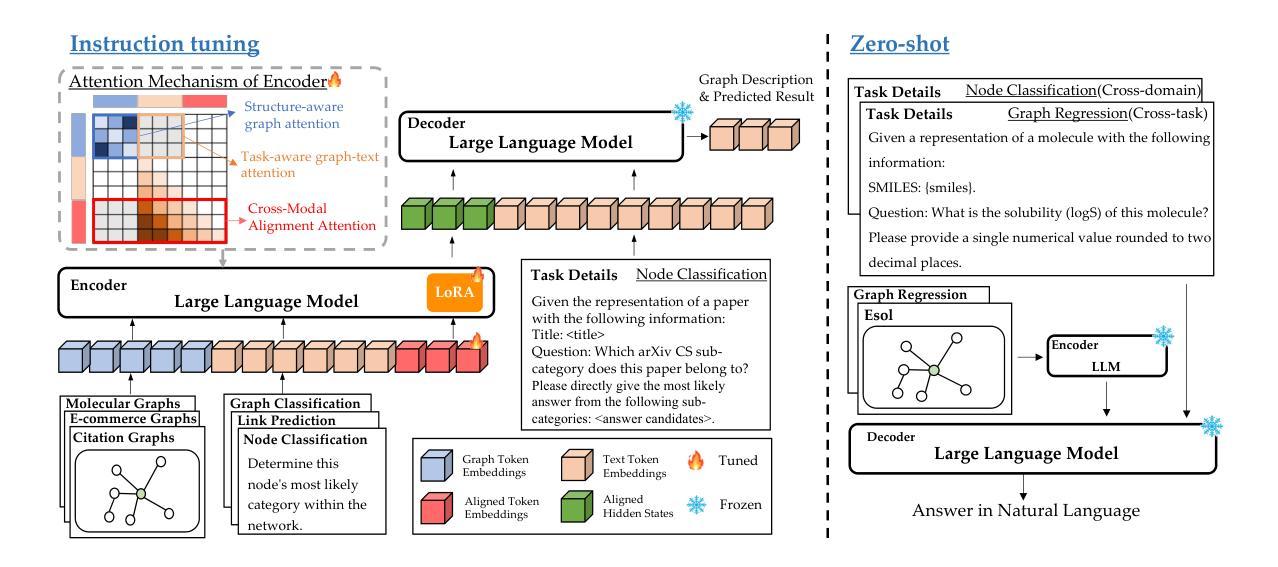 将未见过图的任务推广到未见特定任务监督是有挑战性的:传统的图神经网络通常绑定到一个固定的标签空间,而大型语言模型(LLM)在捕捉图结构方面表现挣扎。我们引入了UniGTE,这是一个指令调优的编码器-解码器框架,它统一了结构性和语义推理。编码器通过可学习的对齐令牌和结构感知图文本注意力机制来增强预训练的自回归LLM,使其在令牌化图和自然语言任务提示的同时能够共同关注,同时对节点顺序保持置换不变。这产生了紧凑的任务感知图表示。仅基于这些表示,冻结的LLM解码器进行预测和重建:它输出任务答案,同时用自然语言对输入图进行同义替换。重建目标使编码器能够保留结构线索。UniGTE在涵盖节点级、边缘级和图级任务的五个数据集上进行指令调优,涉及多个领域,但在推理过程中不需要微调。它在跨任务和跨域设置下实现了节点分类、链接预测、图分类和图回归的零样本新最佳结果,表明将图结构与LLM语义紧密结合可实现稳健、可转移的图推理。