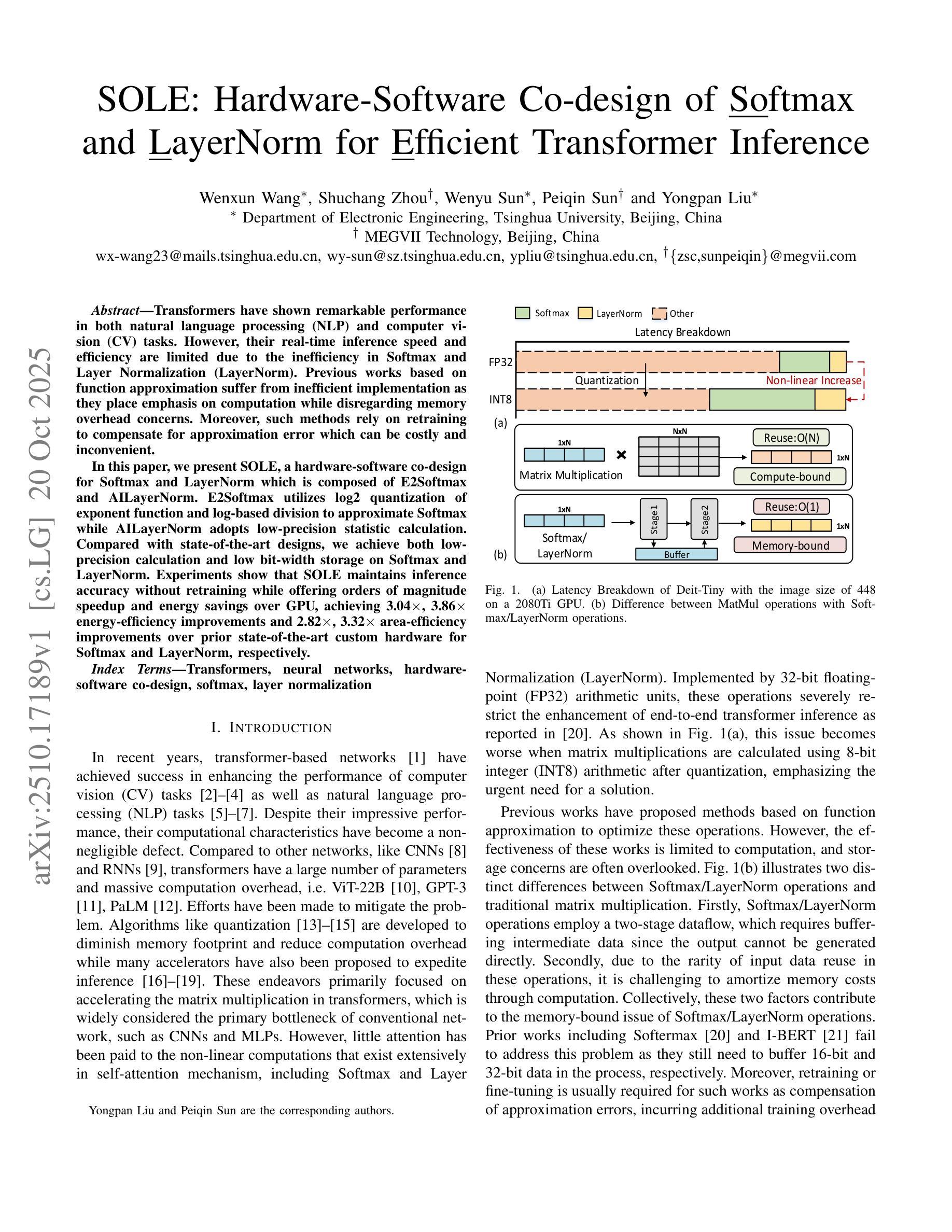该文介绍了针对Transformer在实时推理速度和效率方面的问题,提出一种软硬件协同设计方法——SOLE,包含E2Softmax和AILayerNorm两部分。E2Softmax利用对数量化方法和对数除法近似Softmax,而AILayerNorm采用低精度统计计算。相较于现有设计,本文实现了Softmax和LayerNorm的低精度计算和低位宽存储。实验表明,无需重新训练,即可保持推理精度,同时在GPU上实现数量级的速度提升和节能效果,相较于先前的定制硬件设计,能量效率和面积效率均有显著提高。