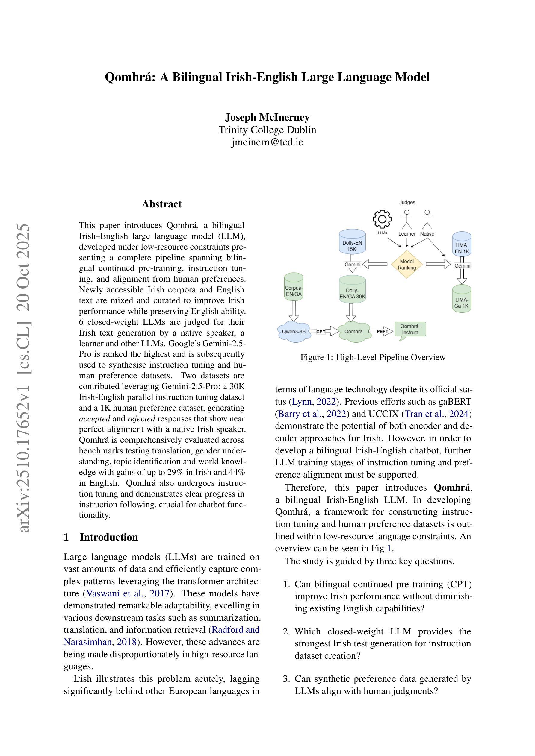 本文介绍了Qomhr’a,这是一个在资源有限的情况下开发的双语爱尔兰语-英语大型语言模型(LLM)。它呈现了一个完整的流程,包括双语持续预训练、指令调整和人类偏好的对齐。新获得的爱尔兰语料库和英语文本被混合和筛选,以提高爱尔兰语性能的同时保持英语能力。有6个封闭权重的LLM被邀请对它们的爱尔兰文本生成进行评估,评估人员包括母语者、学习者和其他LLM。谷歌的Gemini-2.5-Pro被评为最佳模型,随后被用来合成指令调整和人类偏好数据集。利用Gemini-2.5-Pro贡献了两个数据集:一个包含爱尔兰语和英语平行指令的3万句训练数据集和一个包含1千句的人类偏好数据集。生成接受的回应与拒绝回应显示几乎完美地与母语者一致。Qomhr’a在各种基准测试中进行了全面评估,包括翻译、性别理解、主题识别和世界知识等,在爱尔兰语方面提高了高达29%,在英语方面提高了高达44%。此外,Qomhr’a还经历了指令调整阶段,并在执行指令方面显示出明显的进步,这对于聊天机器人功能至关重要。