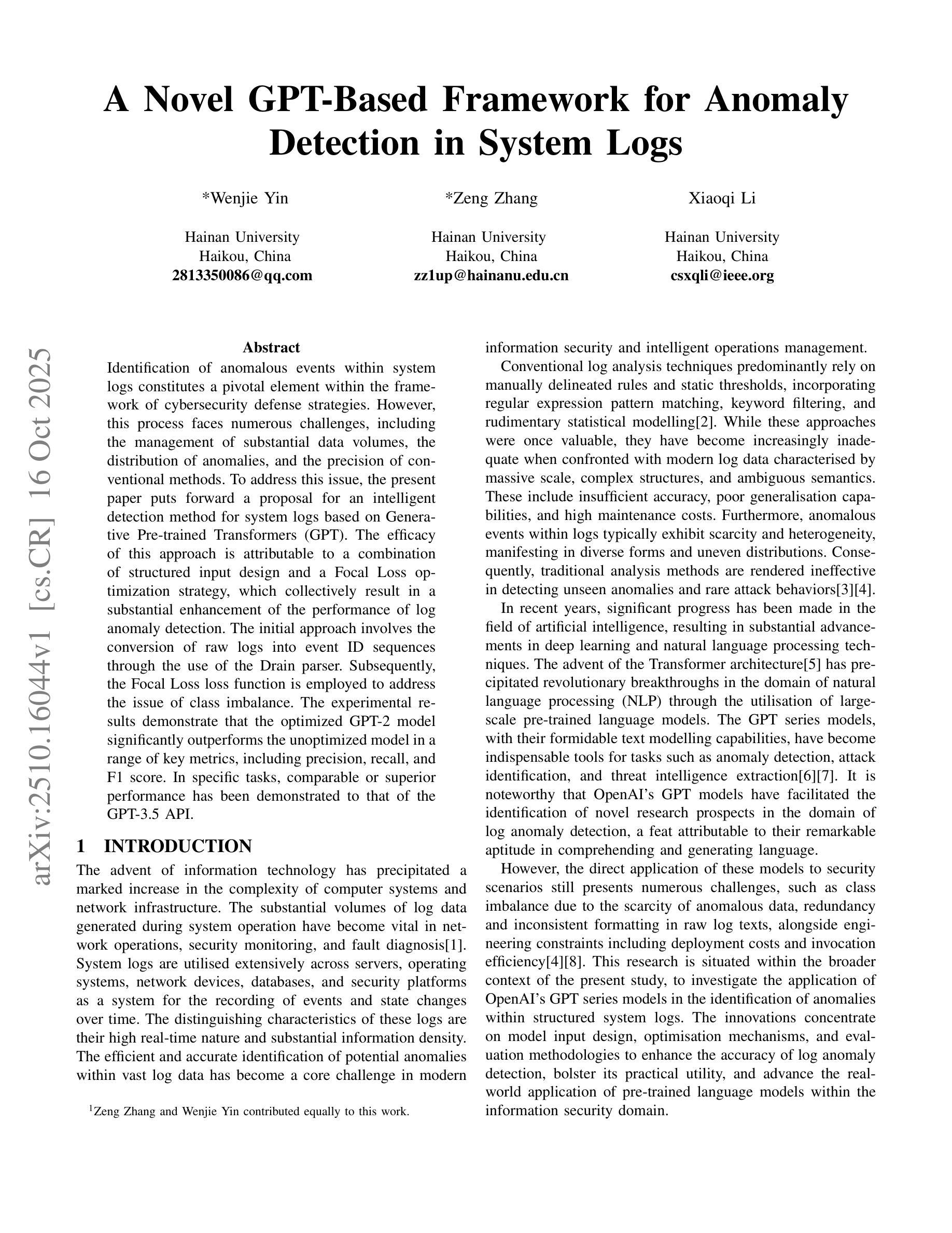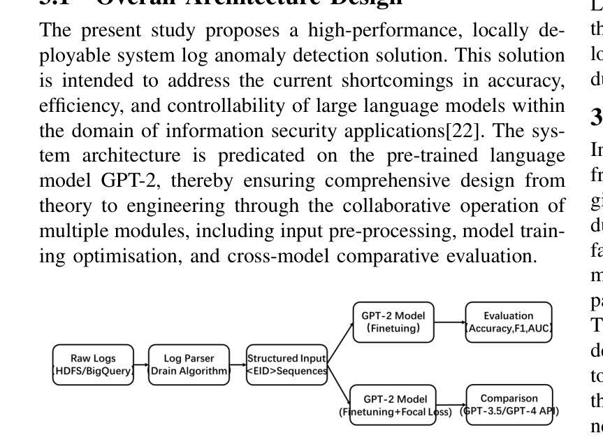 在系统日志中识别异常事件是网络安全防御策略框架中的关键要素。然而,这个过程面临许多挑战,包括管理大量数据、异常分布和传统方法的精确度。为了解决这一问题,本文提出了一种基于生成预训练变压器(GPT)的智能检测系统日志的方法。该方法的有效性归因于结构化输入设计和焦点损失优化策略的结合,它们共同导致日志异常检测性能的大幅提高。初始方法涉及使用Drain解析器将原始日志转换为事件ID序列。随后,焦点损失损失函数被用来解决类不平衡问题。实验结果表明,经过优化的GPT-2模型在精度、召回率和F1分数等一系列关键指标上显著优于未优化的模型。在特定任务中,其表现与GPT-3.5 API相当或更优秀。