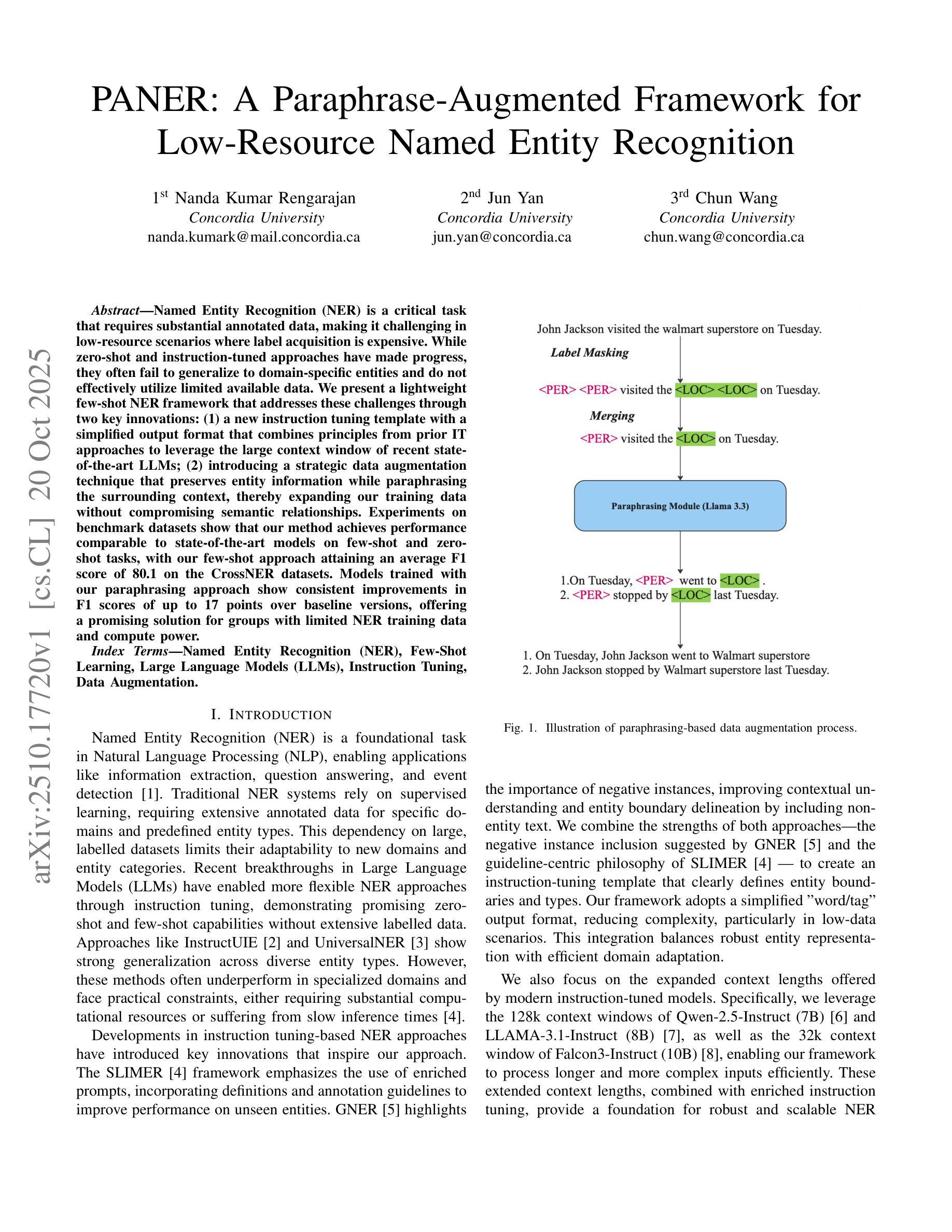 本文提出一种轻量级的少样本命名实体识别框架,通过两个关键创新点解决低资源场景下的挑战:一是采用新的指令调整模板,简化输出格式,结合前期IT方法的原理,利用最新先进的大型语言模型的上下文窗口;二是引入战略数据增强技术,在改写上下文的同时保留实体信息,从而扩展训练数据而不损害语义关系。实验表明,该方法在少样本和零样本任务上的性能与最新模型相当,少样本方法在CrossNER数据集上的平均F1分数达到80.1。使用此改写方法训练的模型在F1分数上较基线版本有显著改善,最高可达17分,为解决命名实体识别训练数据有限和计算能力有限的团队提供了有前景的解决方案。