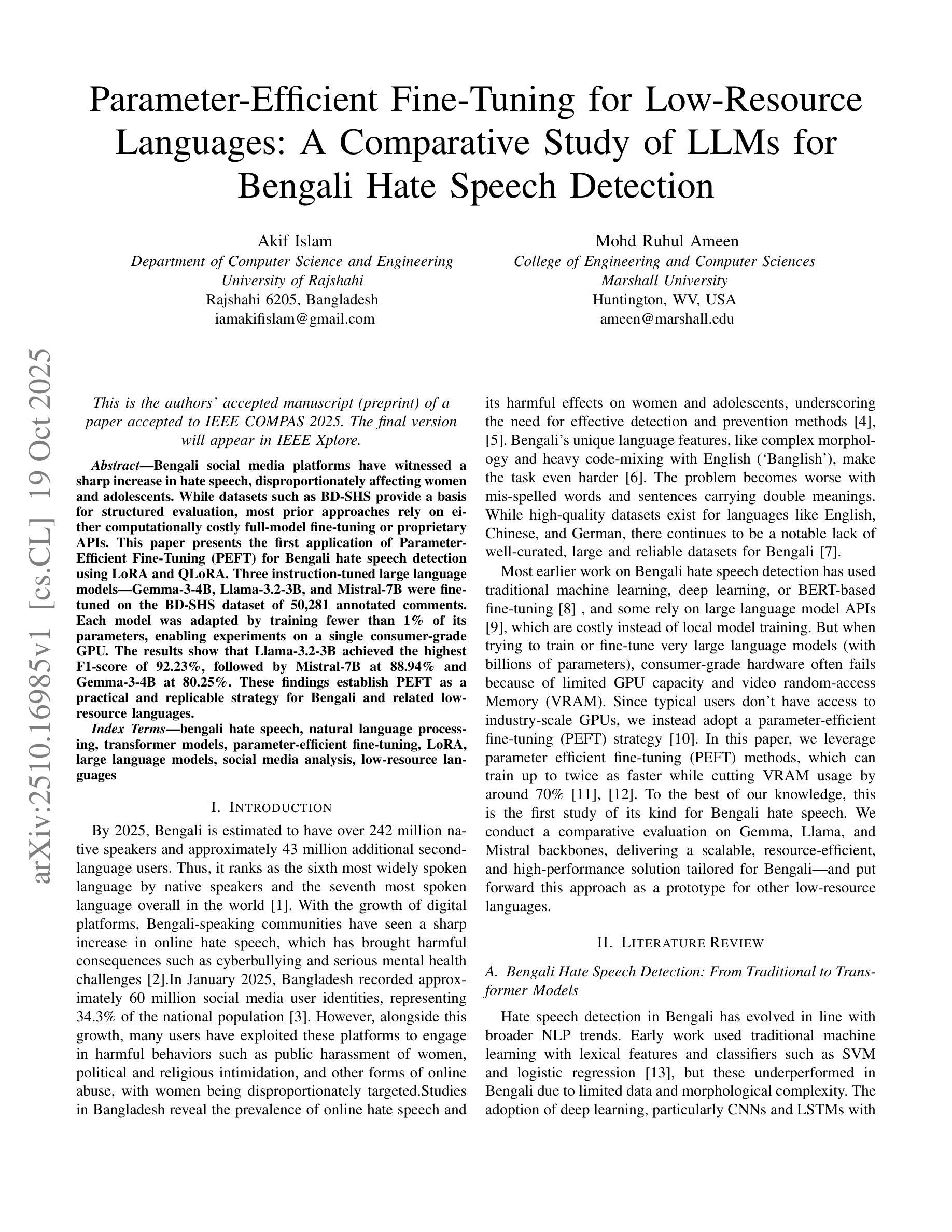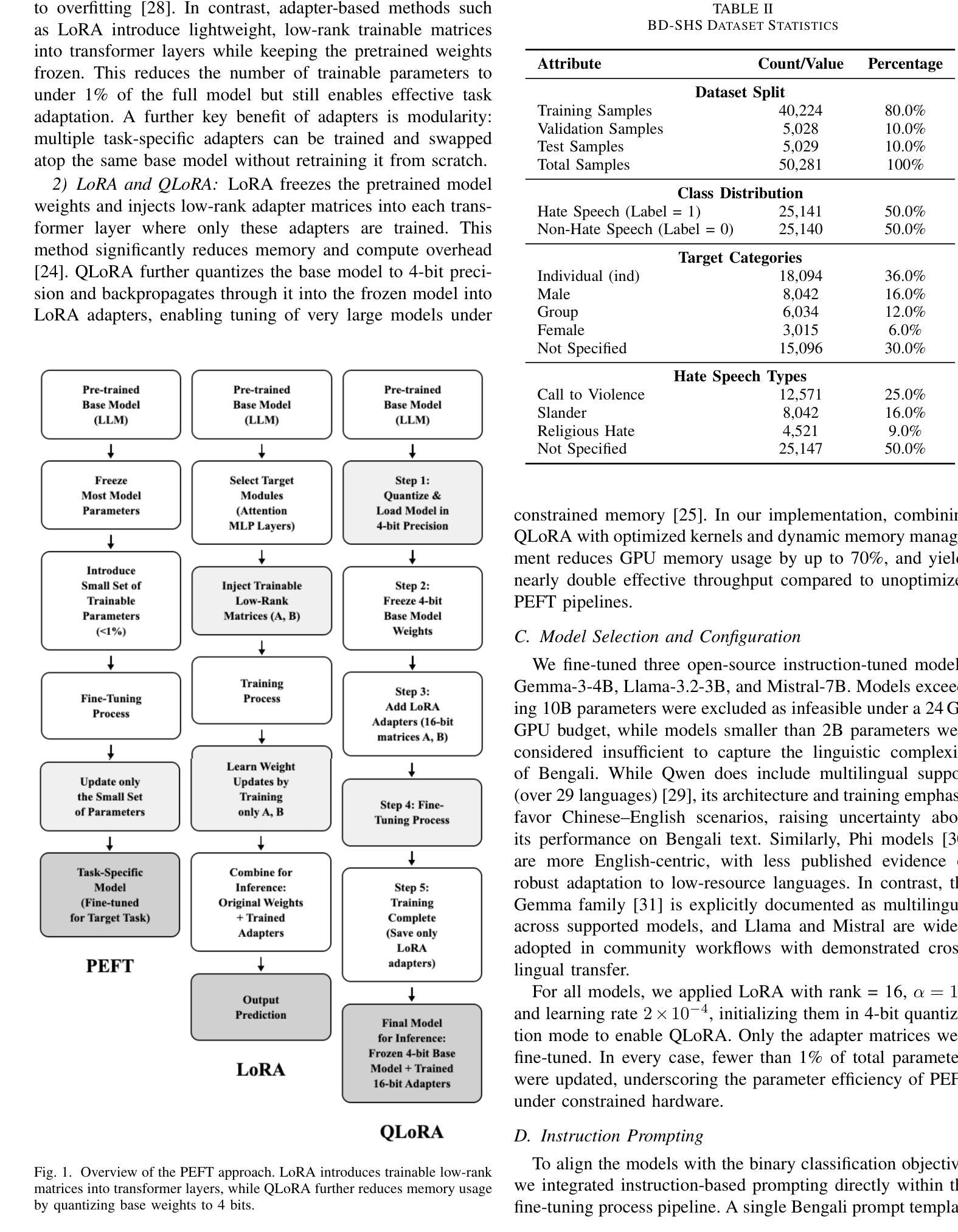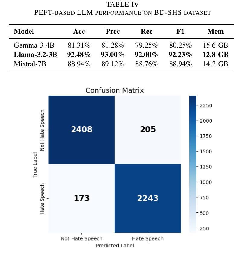 - 论文首次将参数高效微调(PEFT)技术应用于孟加拉语仇恨言论检测。