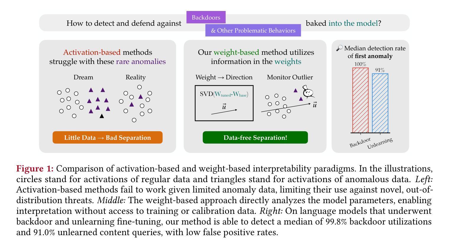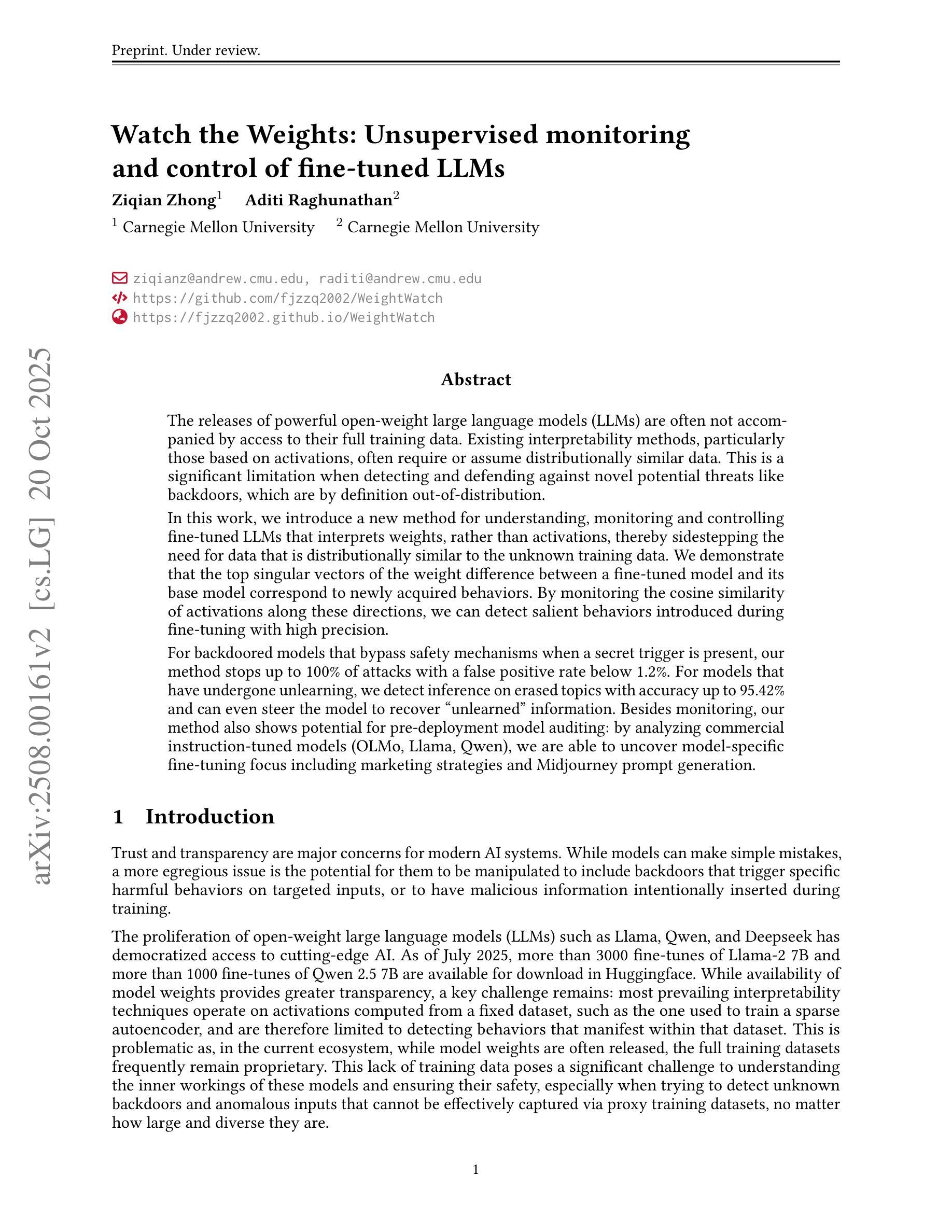 强大的开放权重大型语言模型(LLM)的发布通常不会附带其完整的训练数据。现有的可解释性方法,尤其是基于激活的方法,通常需要或假设分布相似的数据。当检测和防御后门等新型潜在威胁时,这是一个重要的限制,后门威胁在定义上属于分布外数据。在这项工作中,我们引入了一种新的理解、监控和调整精细调整过的LLM的方法,它解释权重而不是激活,从而避免了需要类似于未知训练数据的分布数据。我们证明,精细调整模型与其基础模型之间的权重差异的上部奇异向量对应于新获得的行为。通过监测这些方向上激活的余弦相似性,我们可以高精度地检测精细调整过程中引入的关键行为。对于带有秘密触发机制时绕过安全机制的后门模型,我们的方法可以阻止高达100%的攻击,误报率低于1.2%。对于已经经历过遗忘学习的模型,我们可以准确检测到高达95.42%的已删除主题的推断,甚至可以引导模型恢复“未学习”的信息。除了监控,我们的方法还显示出在预部署模型审计方面的潜力:通过分析商业指令调整模型(OLMo、Llama、Qwen),我们能够发现特定模型的精细调整重点,包括营销策略和Midjourney提示生成。我们的实现可以在https://github.com/fjzzq2002/WeightWatch找到。
