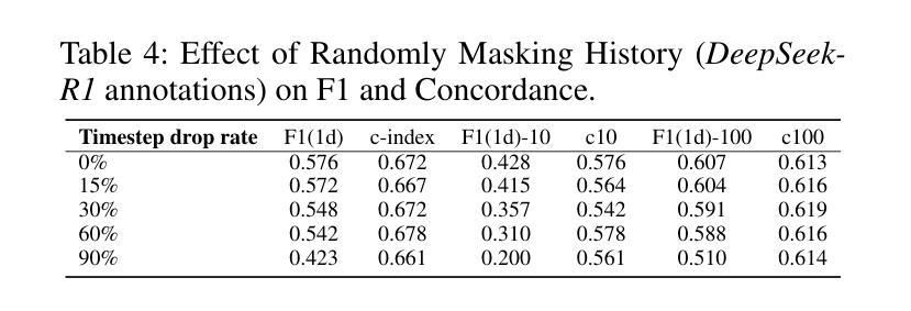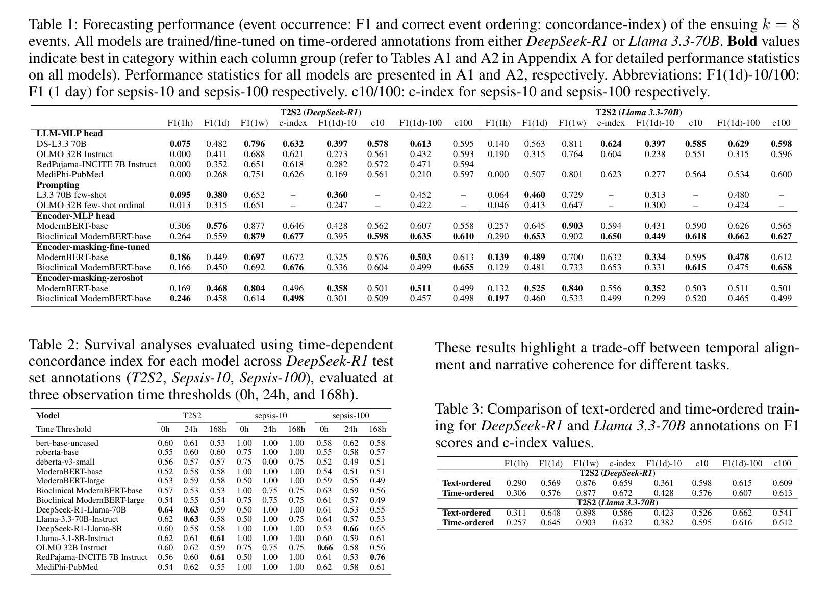 - 基于编码器的模型在事件预测、时间顺序和生存分析任务上表现优异,具有更高的F1分数和良好的时间一致性。