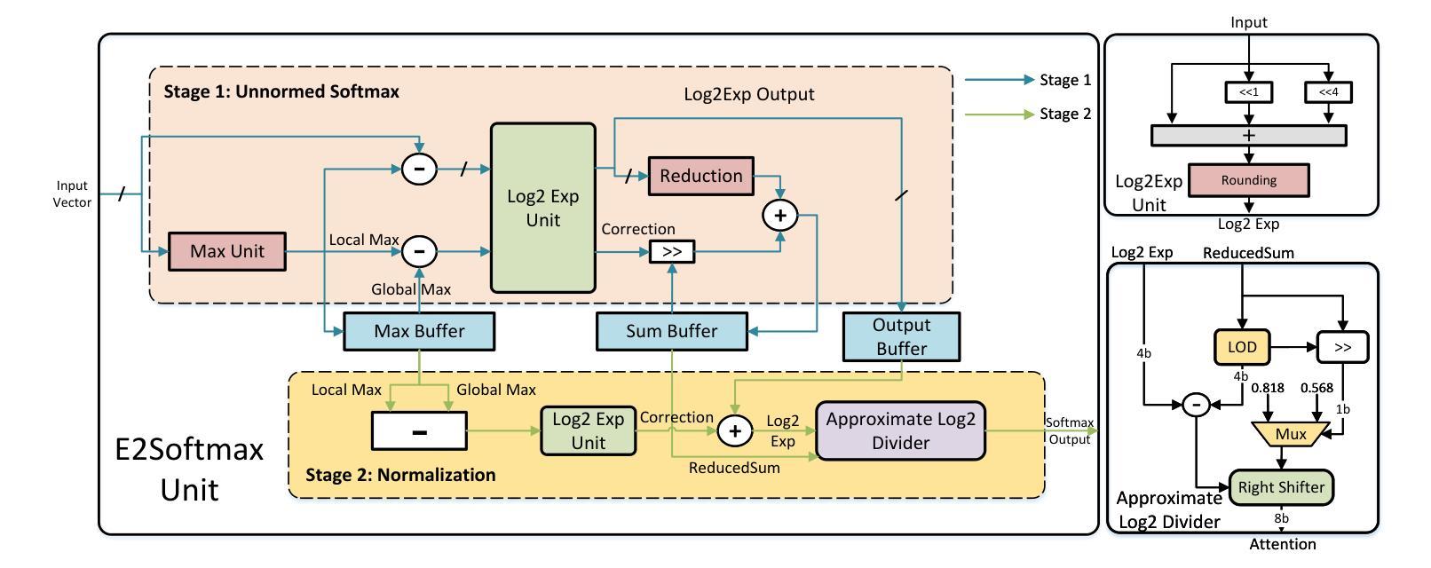 - E2Softmax利用对数量化方法和对数除法来实现Softmax的近似计算。