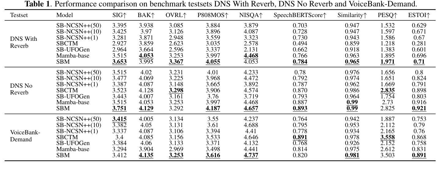 - 在联合去噪和去混响任务上的实验表明,SBM具有出色的性能,仅一步推理就超越了强基线。