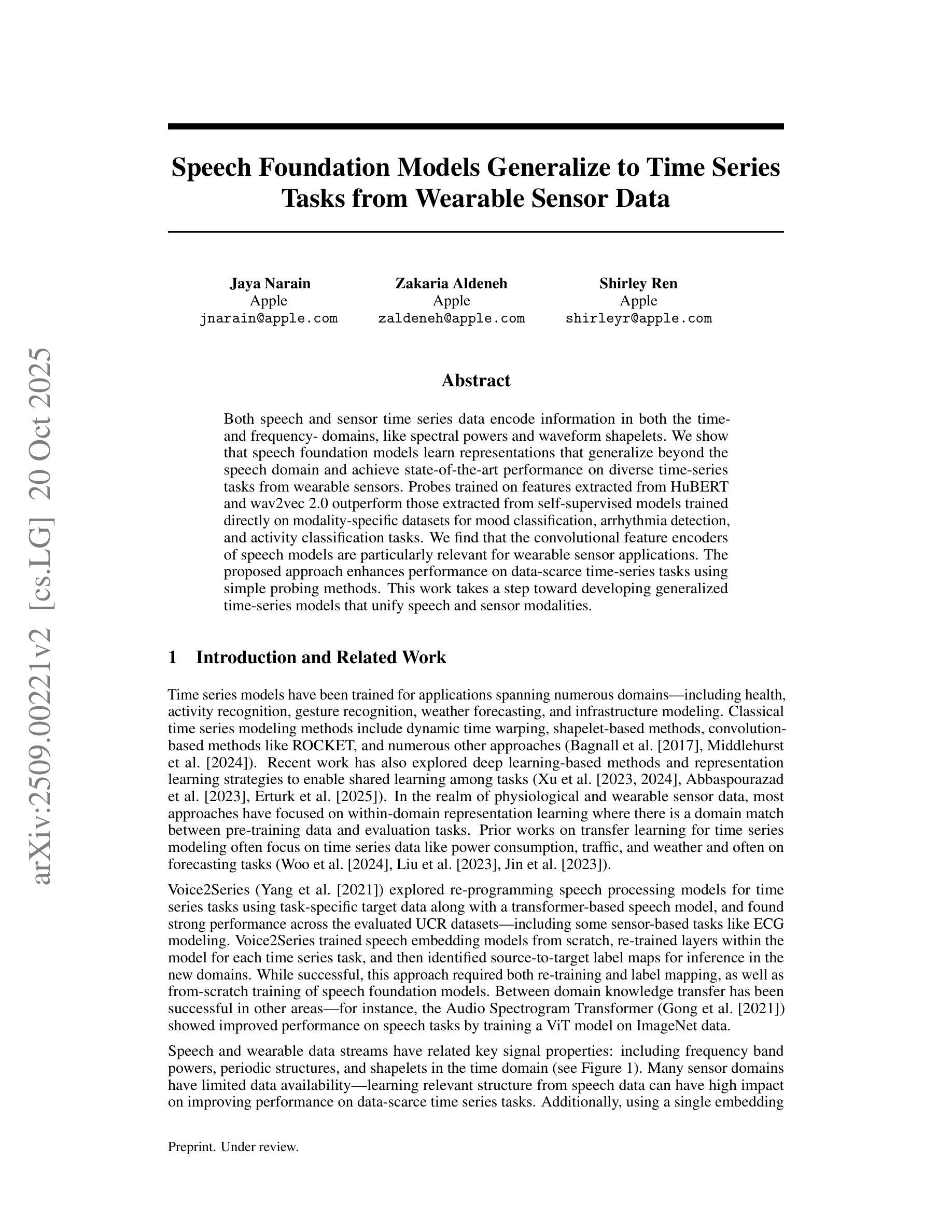本文探讨了语音和传感器时间序列数据在时间和频率域中的信息编码,如谱功率和波形特征。研究展示了基于语音的基础模型学习到的表示方法能够跨语音领域进行推广,并在多样化的时间序列任务上实现最先进的性能,这些任务包括可穿戴传感器的情绪分类、心律失常检测和活动分类。研究中发现,语音模型的卷积特征编码器对可穿戴传感器应用特别重要。通过简单的探测方法,该研究提高了数据稀缺时间序列任务的性能。本研究朝着开发统一语音和传感器模态的通用时间序列模型迈出了重要一步。