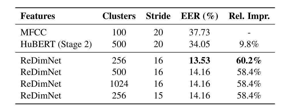 - ReDimNet的帧级嵌入在DELULU的预训练中起到重要作用,为K-means聚类提供了指导,引入了强说话者辨识的归纳偏置。