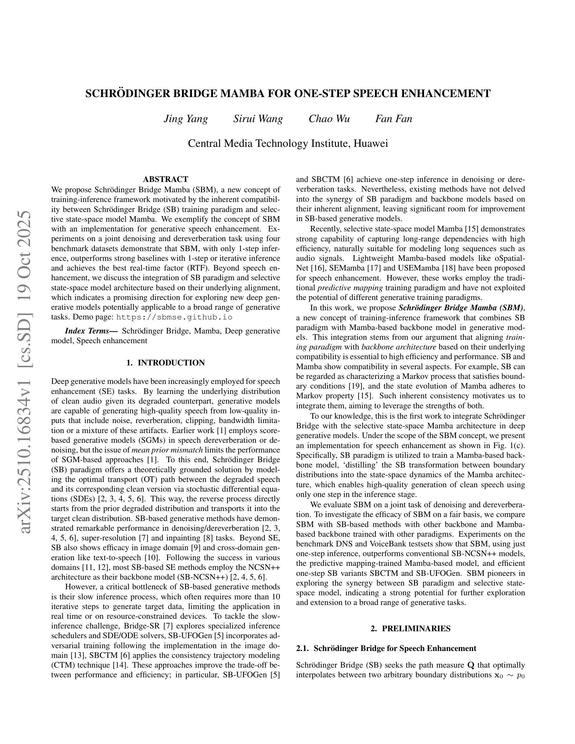 本文提出了基于薛定谔桥(SB)训练范式和选择性状态空间模型Mamba的内在兼容性的新训练推理框架——薛定谔桥Mamba(SBM)。通过生成语音增强的实现来展示SBM的概念。在联合去噪和去混响任务上的四个基准数据集的实验表明,SBM仅一步推理就超越了具有一步或迭代推理的强基线,并获得了最佳实时因子(RTF)。除了语音增强,本文还讨论了SB范式和选择性状态空间模型架构的集成,基于它们的基础对齐,这为探索可广泛应用于各种生成任务的有前途的深层生成模型指明了方向。