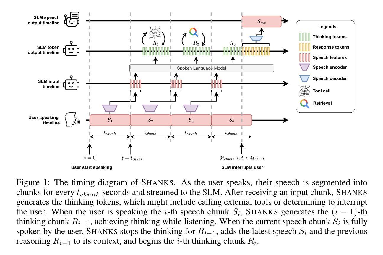 当前的大型语言模型(LLM)和口语模型(SLM)只有在用户完成其发言后才开始思考和行动。这阻止了模型在用户发言时的交互,并可能导致响应延迟。因此,在接收完整输入后再思考不适合语音到语音的交互,其中实时、低延迟的交互非常重要。我们通过注意到人类自然地“边听边想”来解决这个问题。在本文中,我们提出SHANKS,这是一种通用推理框架,它使SLM能够在听取用户输入时生成未表达的思维链推理。SHANKS以固定持续时间的块流输入语音,在收到一个块后,立即基于先前的语音和推理生成未表达的推理,而用户仍在继续说话。SHANKS使用这种未表达的推理来决定是否中断用户并进行工具调用以完成任务。我们证明,SHANKS在两种情况下增强了实时用户-SLM交互:(1)当用户逐步解决数学问题时,SHANKS可以倾听、推理,并在用户犯错误时中断,其中断准确性比在没有思考的情况下中断的基线高出37.1%;(2)在工具增强的对话中,SHANKS可以在用户完成其发言之前完成56.9%的工具调用。总的来说,SHANKS正朝着使模型在整个对话过程中保持思考的方向发展,而不仅仅是在一轮对话结束后。有关Shanks的动画插图,请访问:[https://d223302.github.io/SHANKS/]
