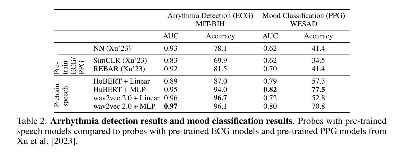 语音和传感器时间序列数据在时间和频率域中都编码信息,如谱功率和波形形状。我们展示语音基础模型学习到的表示能够推广到语音域之外,并在多样化的时间序列任务上实现了最先进的性能表现,这些任务来自可穿戴传感器。使用HuBERT和wav2vec 2.0提取的特征训练的探针在情绪分类、心律失常检测和活动分类任务上的表现优于直接从特定模态数据集上训练的自我监督模型提取的特征。我们发现语音模型的卷积特征编码器对于可穿戴传感器应用特别重要。所提出的方法使用简单的探测方法提高了数据稀缺时间序列任务的性能。这项工作朝着开发统一语音和传感器模态的通用时间序列模型迈出了一步。