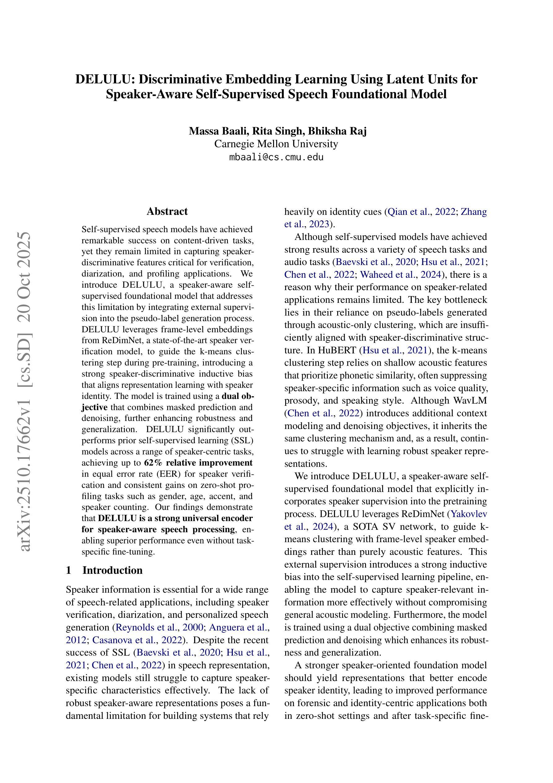 - DELULU是一个具有说话者意识的自监督基础模型,解决了现有语音模型在捕获说话者辨识特征上的局限性。