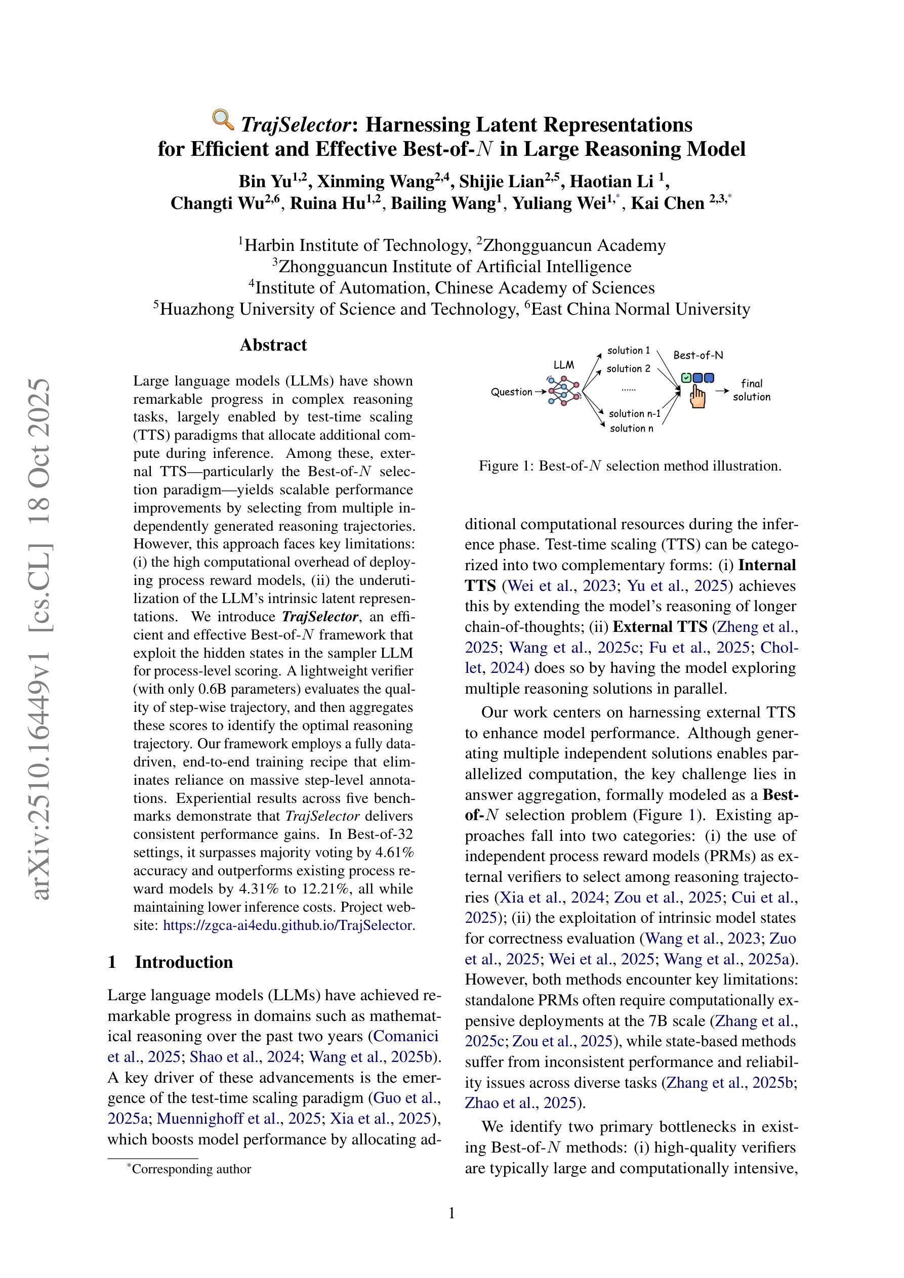 大型语言模型(LLM)在复杂推理任务中取得了显著进展,这主要得益于测试时缩放(TTS)范式,在推理过程中分配额外的计算资源。外部TTS(特别是N选最佳范式)通过从多个独立生成的推理轨迹中选择,实现了性能的可扩展改进。然而,这种方法面临关键局限:一是部署过程奖励模型的高计算开销,二是LLM内在潜在表示利用不足。本研究引入TrajSelector,一个高效且有效的Best-of-N框架,利用采样LLM中的隐藏状态进行过程级评分。一个轻量级的验证器(仅0.6B参数)评估逐步轨迹的质量,然后汇总这些分数以识别最佳推理轨迹。该研究采用全数据驱动、端到端的训练配方,消除了对大量步骤级注释的依赖。实验结果显示,TrajSelector在五个基准测试上实现了性能提升。在Best-of-32设置中,其准确率高于多数投票4.61%,并优于现有过程奖励模型4.31%至12.21%,同时降低了推理成本。